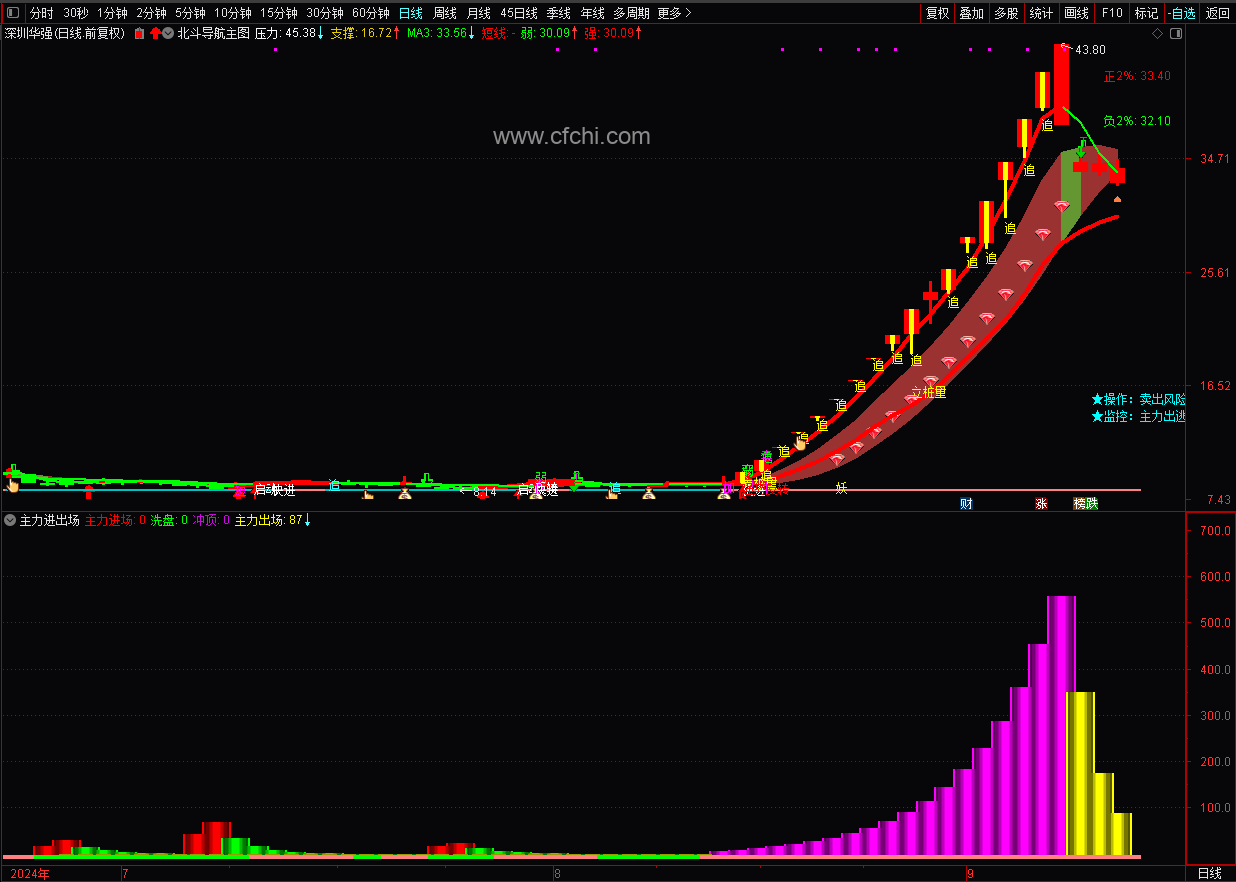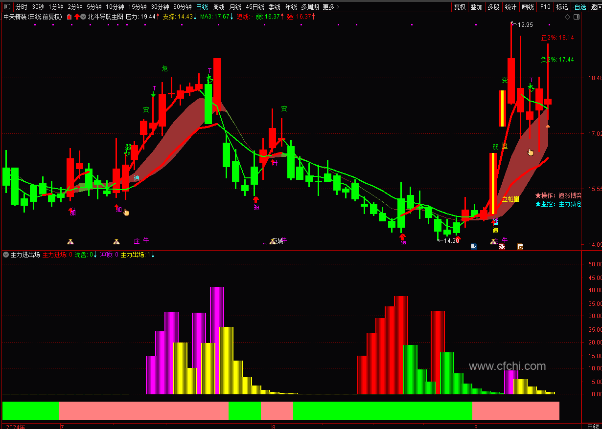 (主力进出场副图,提示主力进场,出场,洗盘,冲顶动态,有波段操作线。)