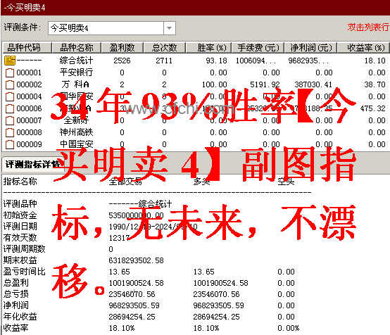 34年93%胜率【今买明卖4】副图指标,无未来,不漂移。【今买明卖】为系列指标分开售卖,使用通达信软件,系列里共分为【今买明卖】1,2,3,4四个指标,全部源码售卖,方便股友研究学习。所有指标不含未来,信号不漂移,购买后可做沙盘推演,所有数据完全真实,准确,不同版本软件数据可能略有偏差,安装后请先下载全部A股1990-2024年全部日线数据后再进行回测。