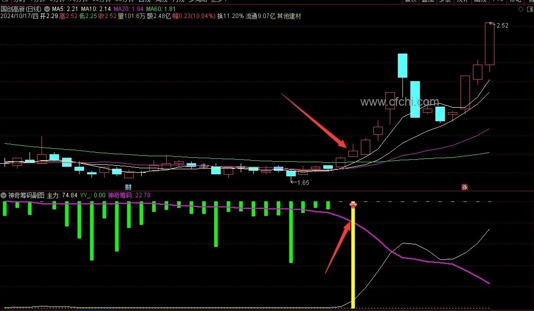 3、出信号后,在紫色筹码线向下、黄色主力线向上运行时持有;
