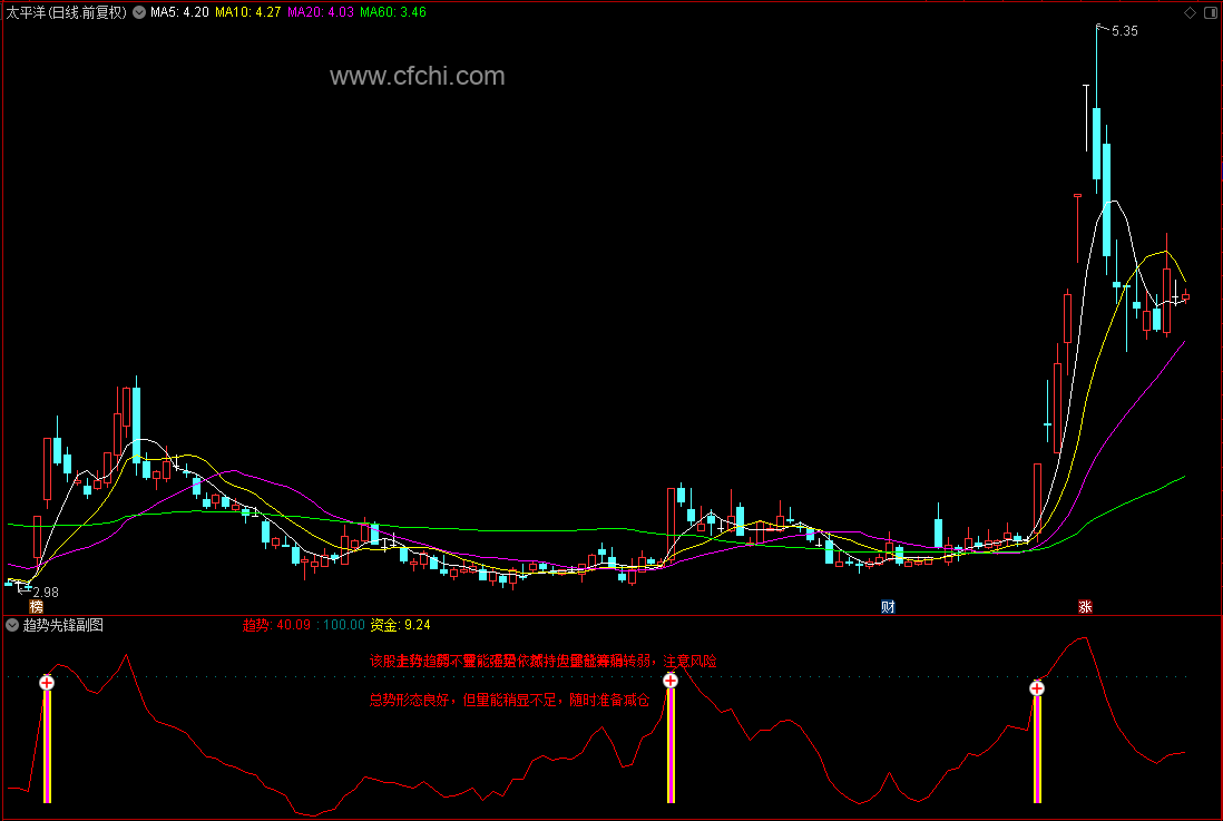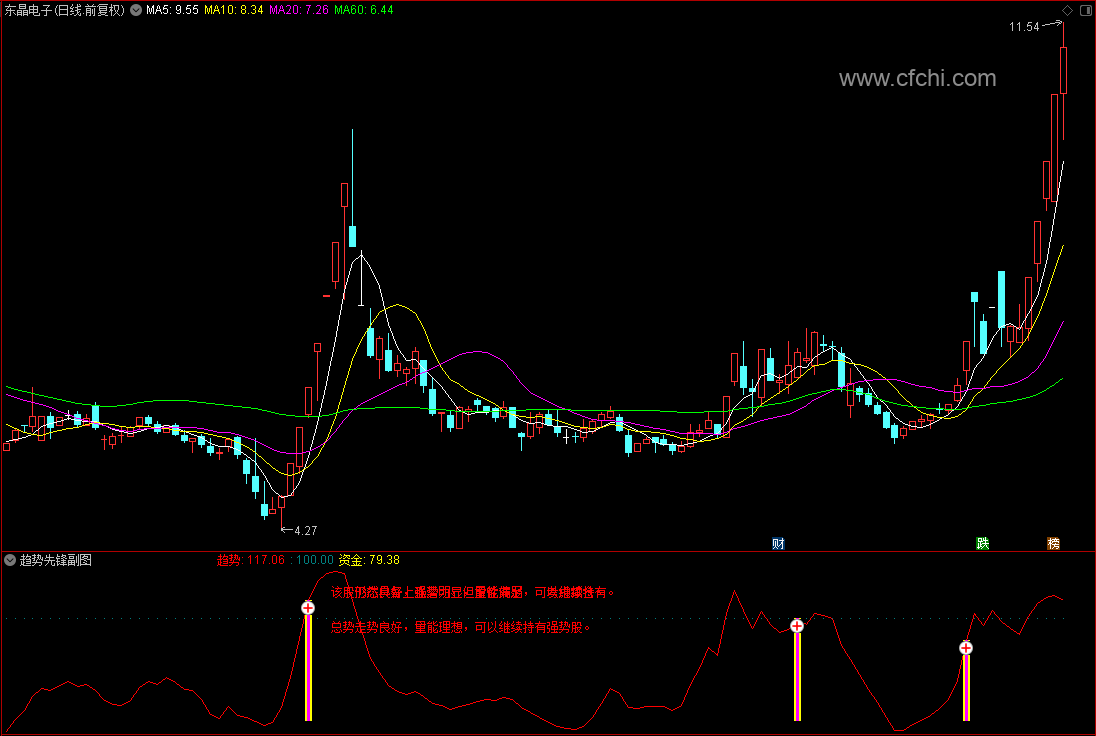 "牛股先锋"捉牛股,当主力资金向上运行启动时,发出"+"号预警,此信号可选股。另添加了个股趋势形态参考,如图中"红色字体说明",信号简单清晰,是一款不错的指标。