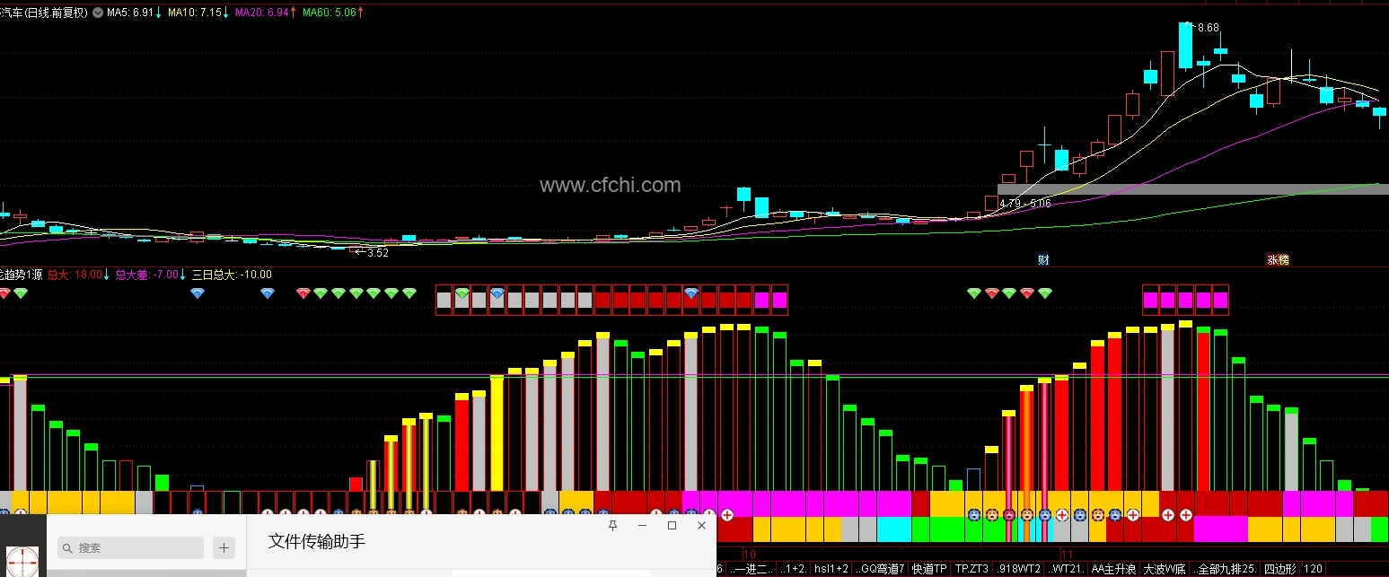 指示,包含底部的背离信号平台画线,动能柱,自学习技巧,与庄共舞绝对趋势