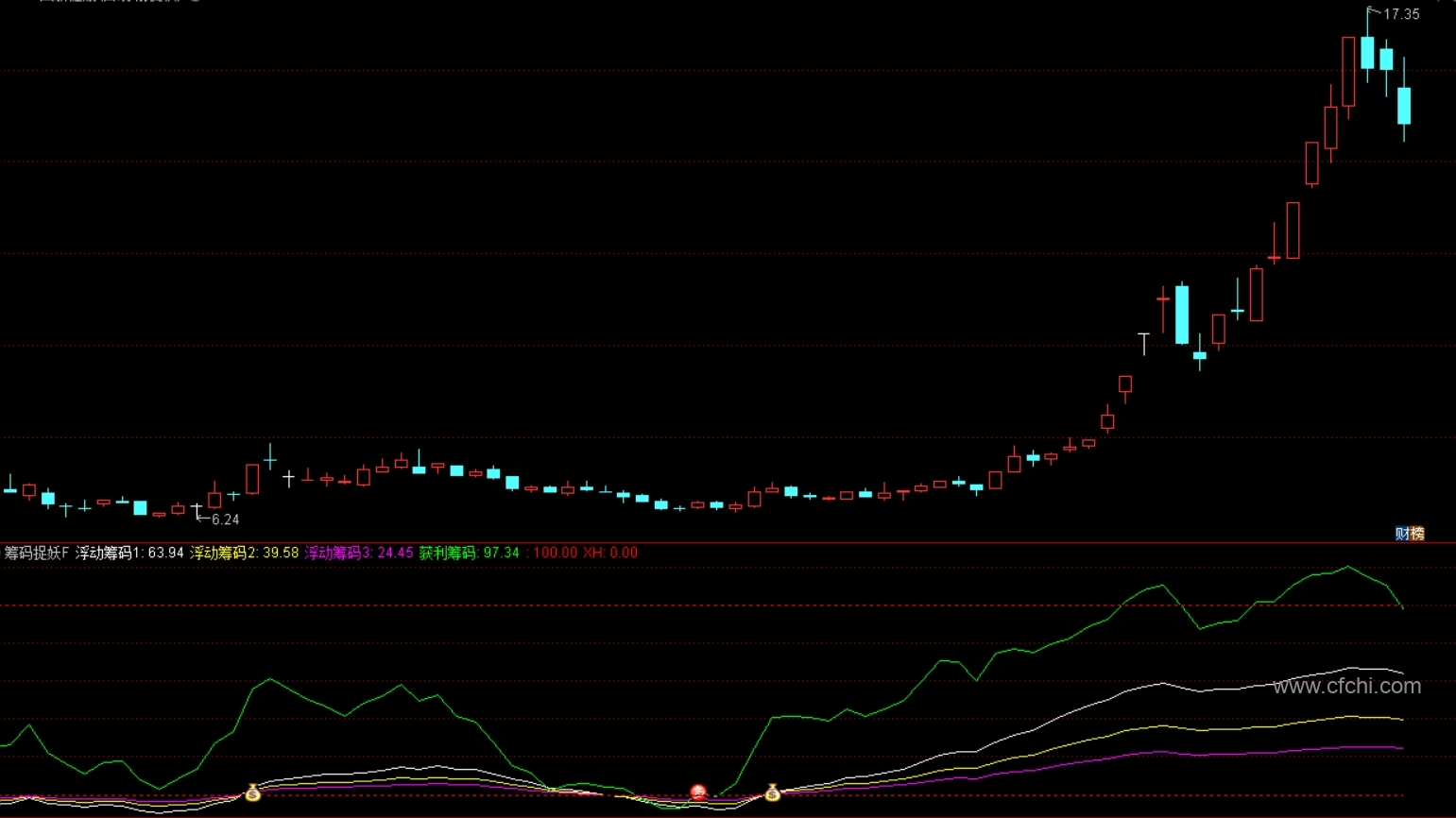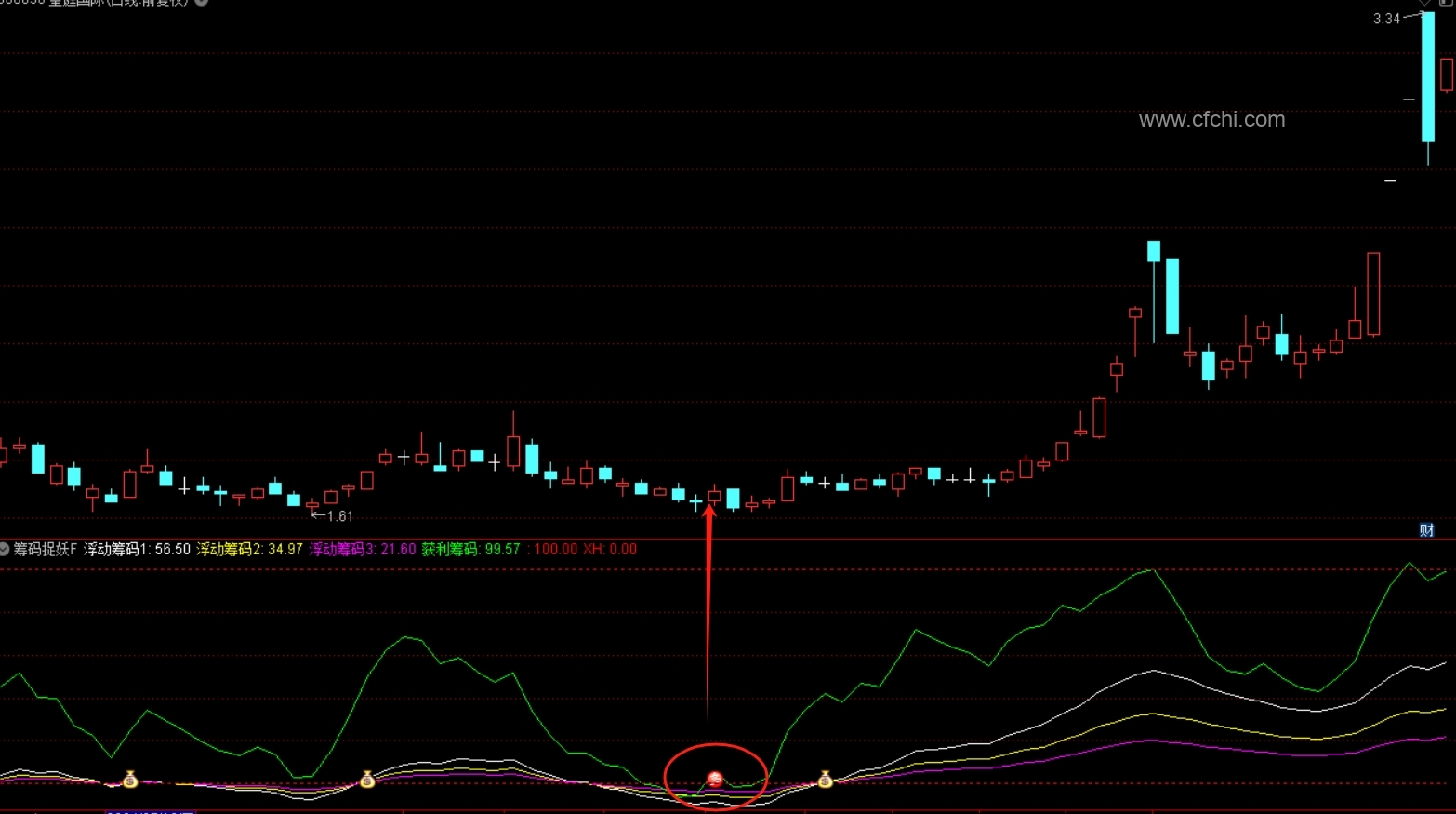 而当三条浮动筹码线开始金叉,而获利筹码线在明显的上部位置,是资金开始活跃的标志,标注为钱袋子;