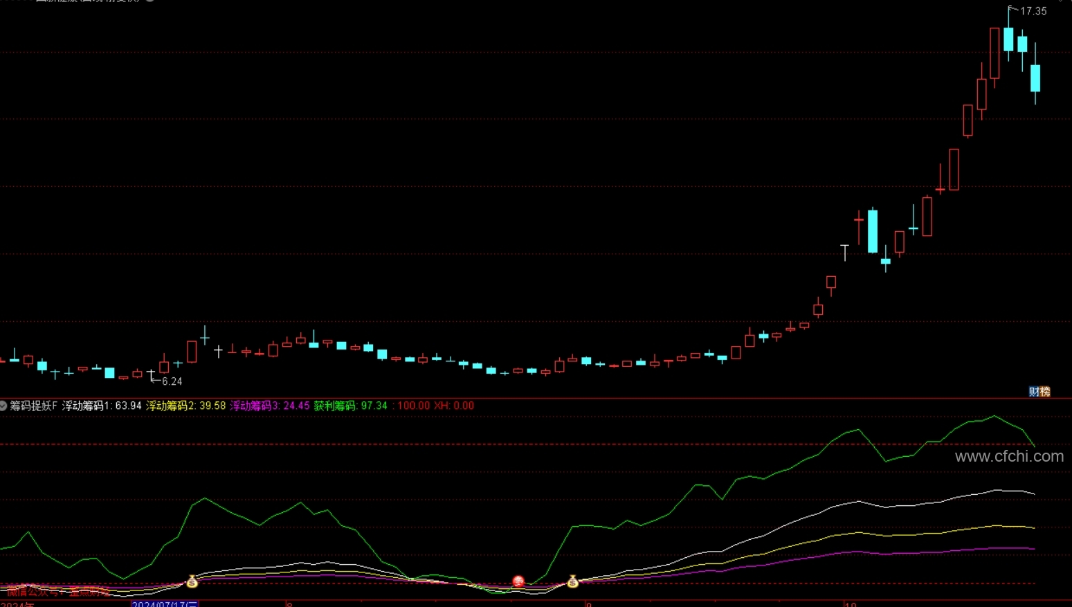 白色线是浮动筹码1,黄色线是浮动筹码2,紫色线是浮动筹码3,是设置了不同周期中,浮动筹码的波动情况;