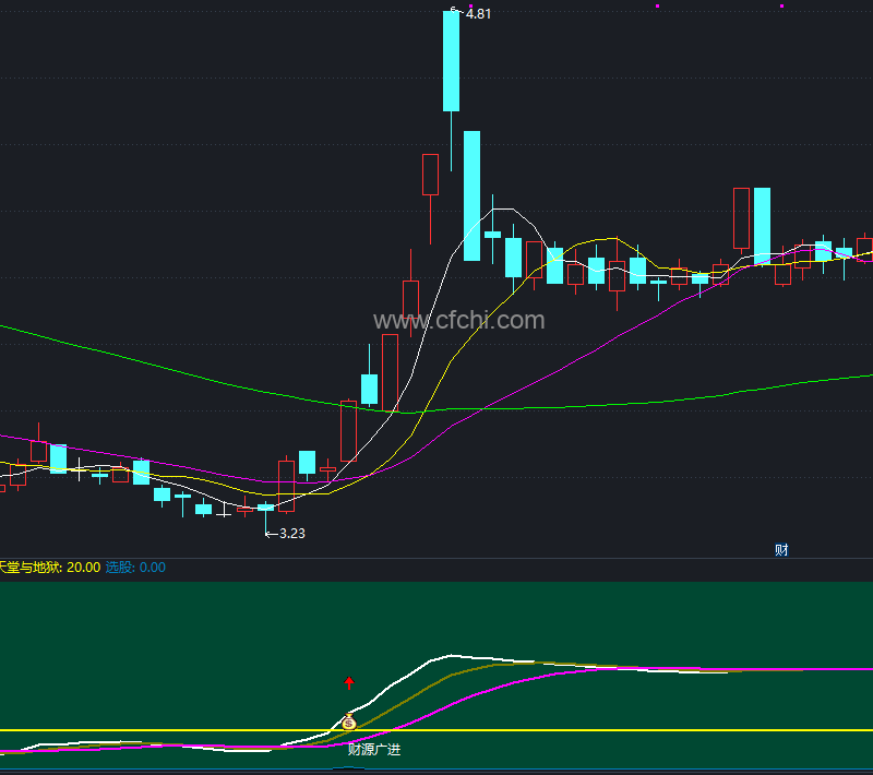 • 当神仙线上穿天堂与地狱线(20)时,可能表示市场进入超买状态,需要警惕价格回落。