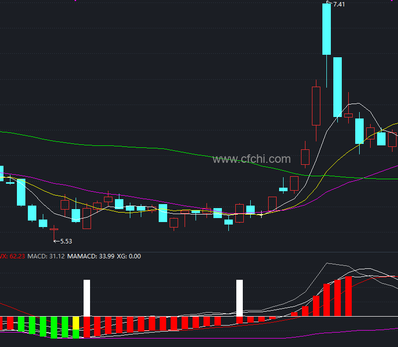 • 当MACD1大于MAMACD1且MACD大于MAMACD,并且前一天的MACD小于前一天的MAMACD或前一天的MACD1小于前一天的MAMACD1,且MAMACD1小于0时,触发XG信号。在0和50位置之间画白色柱状线,表示可能的买入机会。