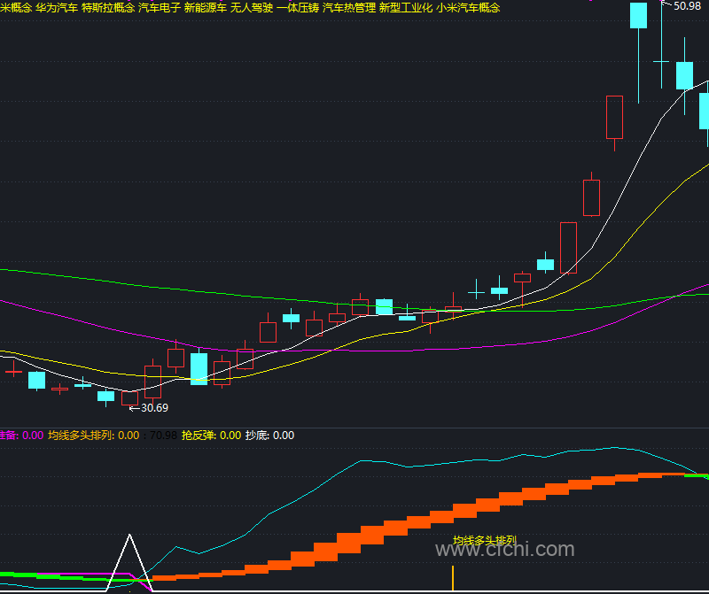• 当均线多头排列返回18时,表示均线呈多头排列,是强烈的买入信号。
