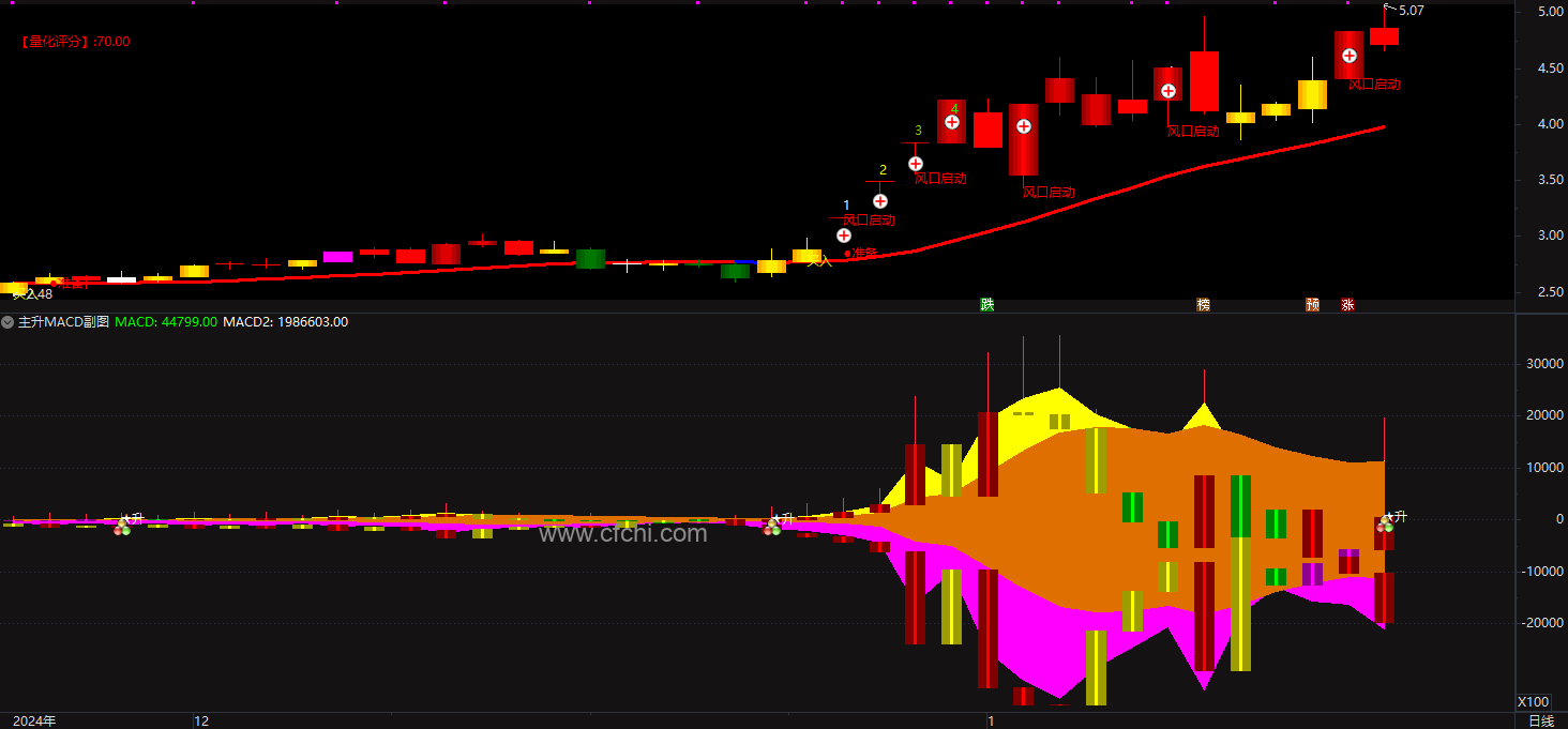 3、紫色飘带向下,黄色飘带向上,中间棕色面积扩大就是主升浪。