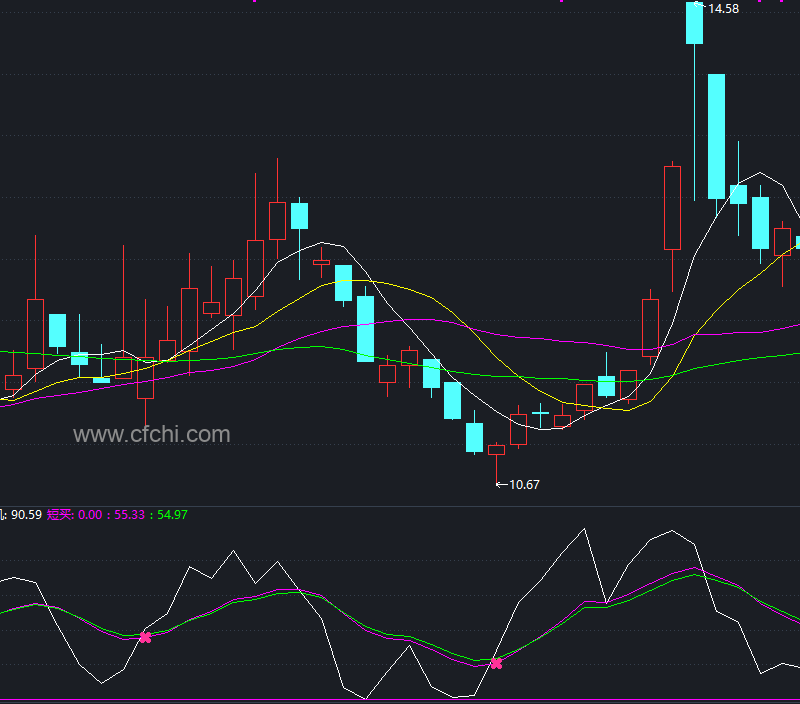• 交叉信号:当短投机指标上穿其5日加权移动平均线,且短投机指标小于50时,表示短期趋势开始向上,返回短投机的5日加权移动平均线值,提示投资者关注买入机会。此时,在图表上绘制紫色的点,线宽为5和3,分别表示不同的信号强度。