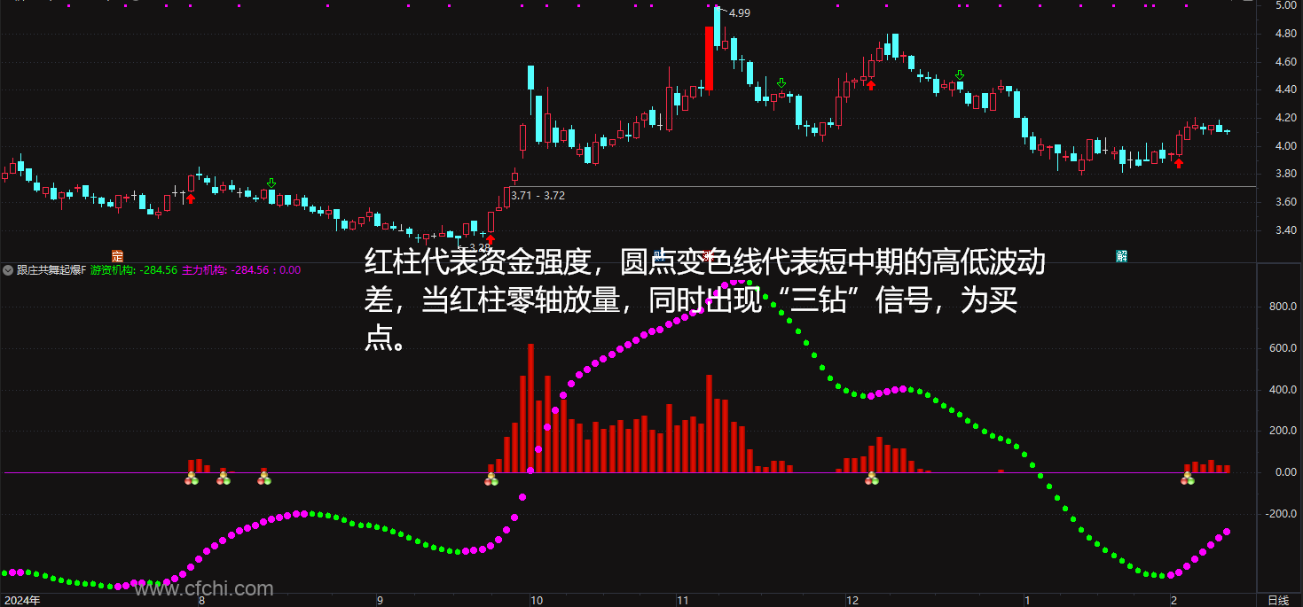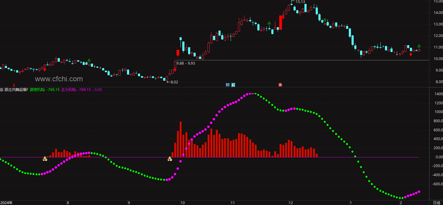 (通达信 跟庄共舞起爆 量能类指标,红柱代表资金强度)