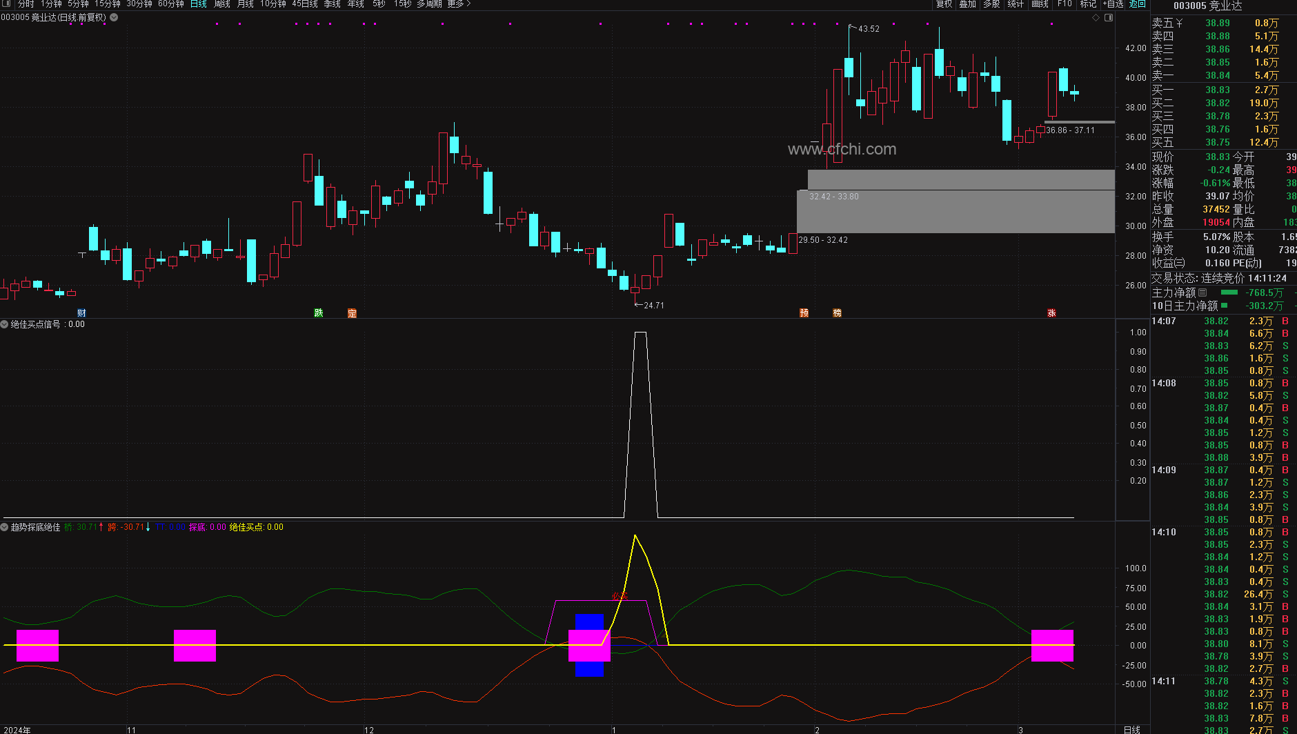 (通达信【趋势探底绝佳买点】副图指标+绝佳买点选股)