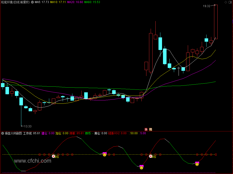 - 同时出现"笑脸"图标且收盘价站上当日最高价;