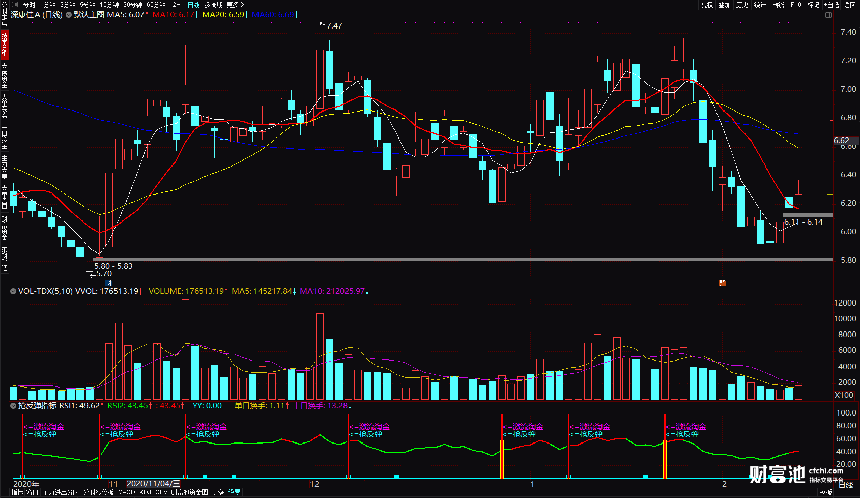 (通达信抢反弹指标 激流淘金抓超跌反弹指标 预警触底反弹选股公式 副图 源码)