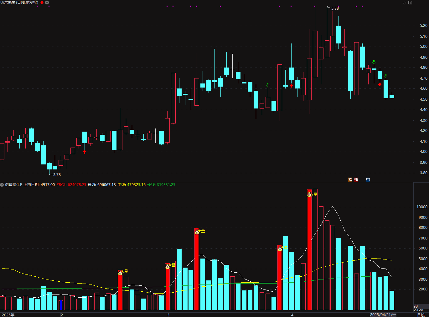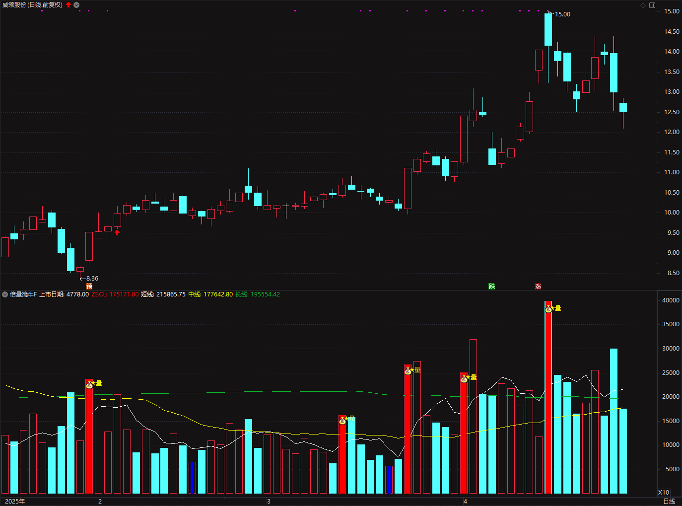 4、在相对低位时,出现一根放量在1.5 - 4倍之间的阳线,而后3天呈现出“量缩价升”的信号,且这3日平均量能低于倍量柱量能。