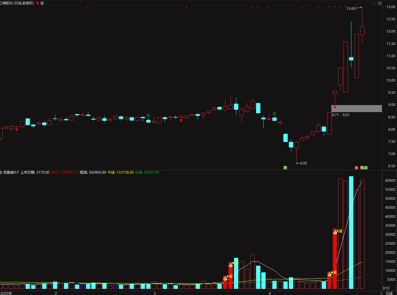 "倍量捉牛战法"是一种基于成交量分析的策略,通过识别特定的成交量和价格关系来判断股价走势。