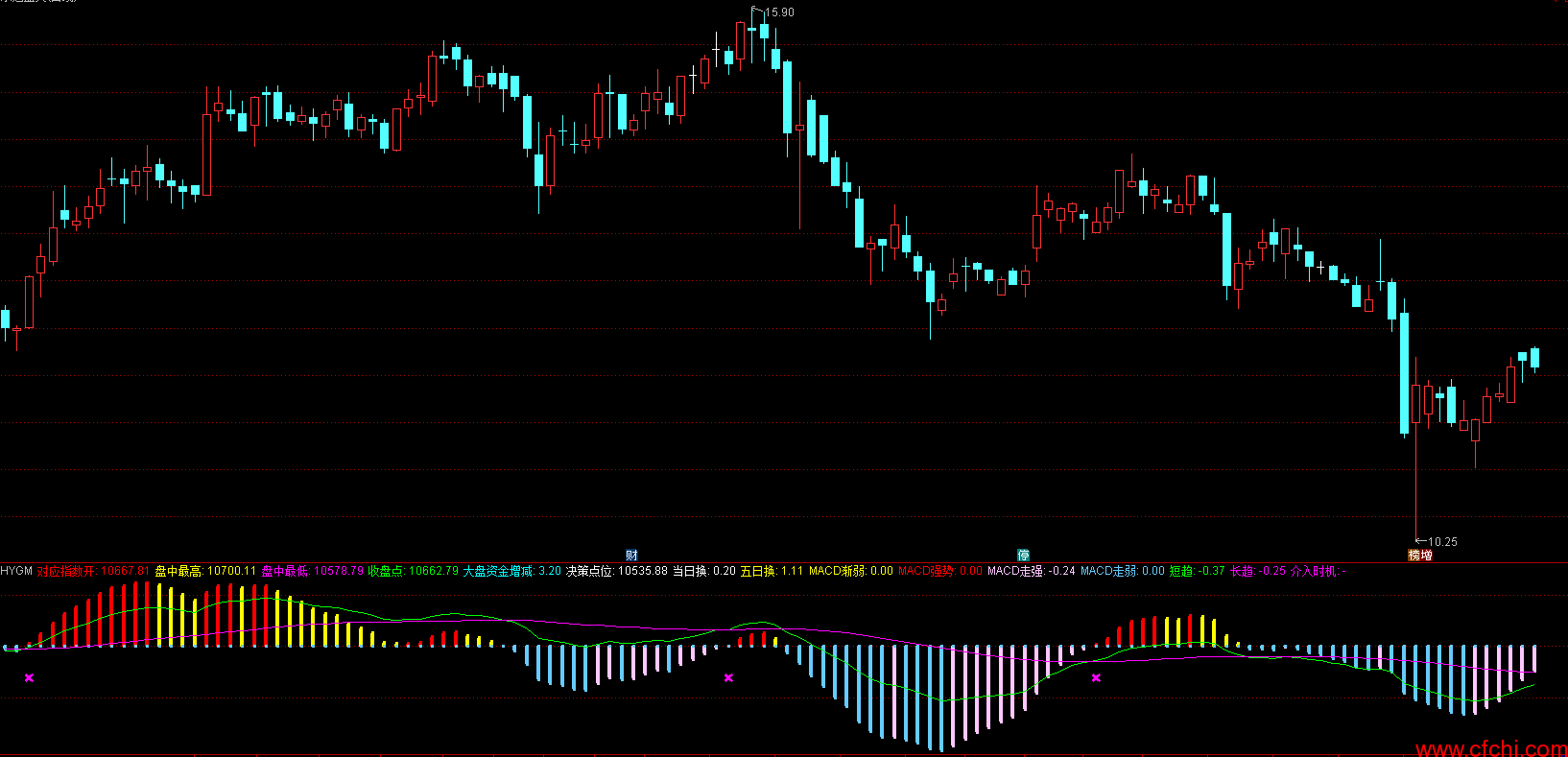 MACD渐弱:IF(VAR3<REF(VAR3,1)&&VAR3>0,VAR3,0),COLORYELLOW,LINETHICK4,STICK;