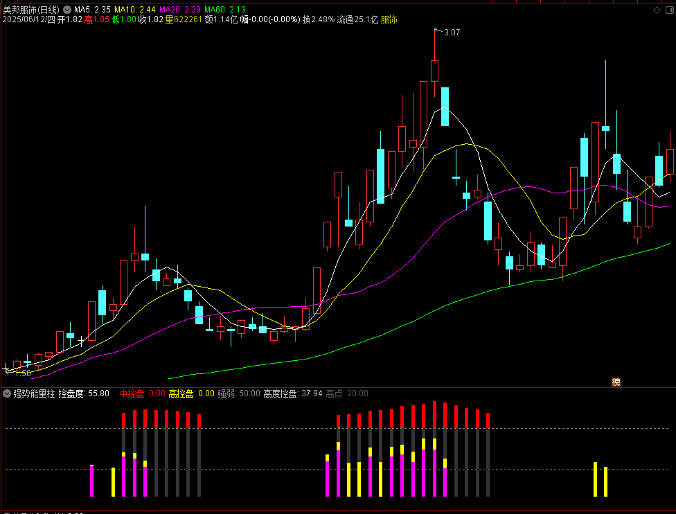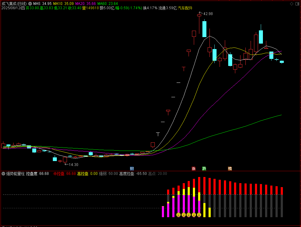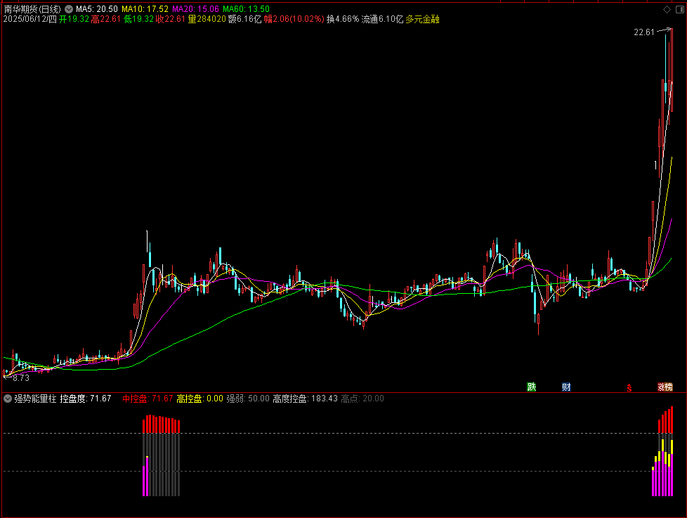 通过计算多周期均线判断主力控盘程度。当短期均线高于中期时,"控盘度"上升,红色柱(中控盘),黄柱(高控盘),表明主力持仓集中。