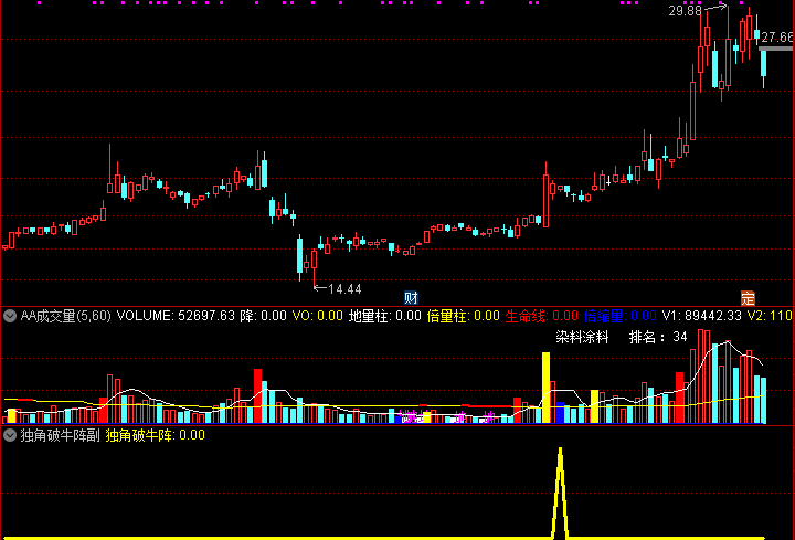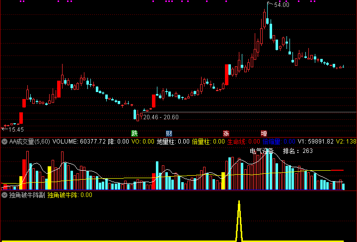 (捕捉尾盘异动阳K 独角破牛阵 副图 选股)