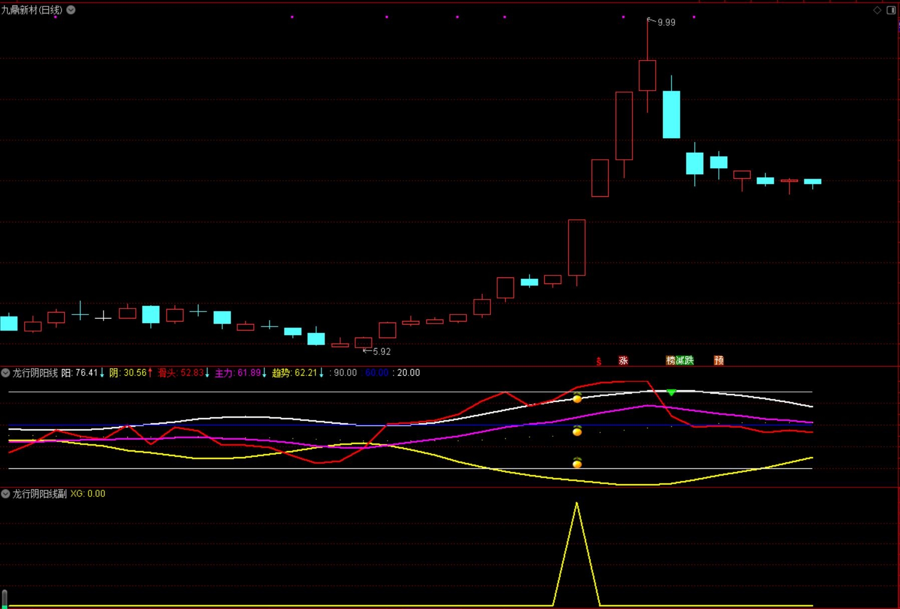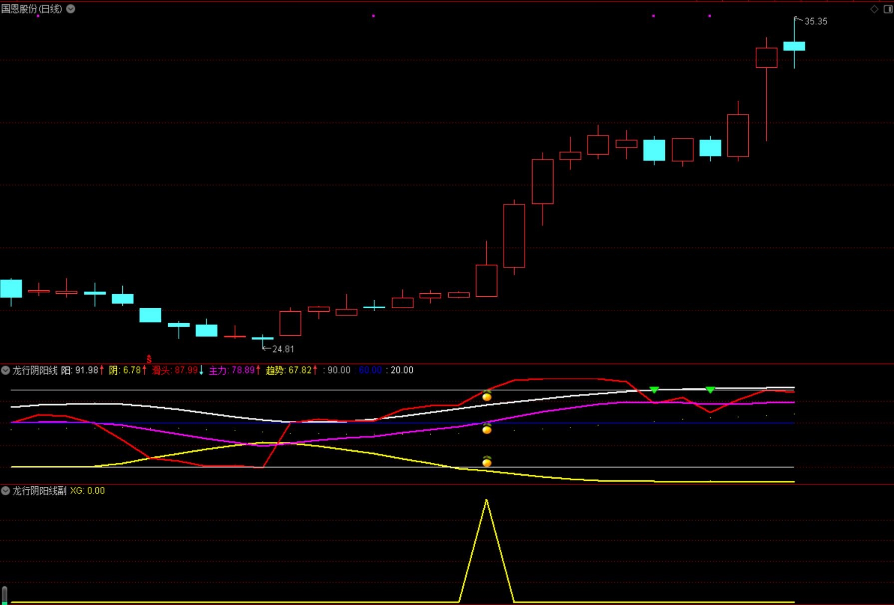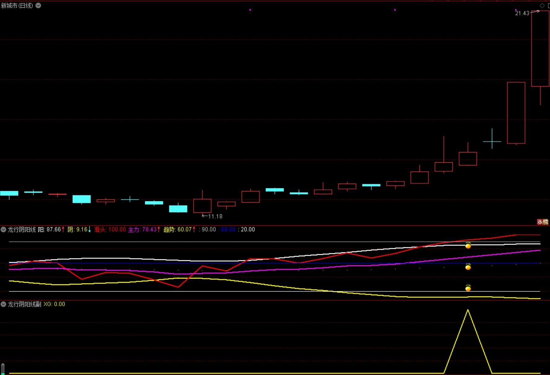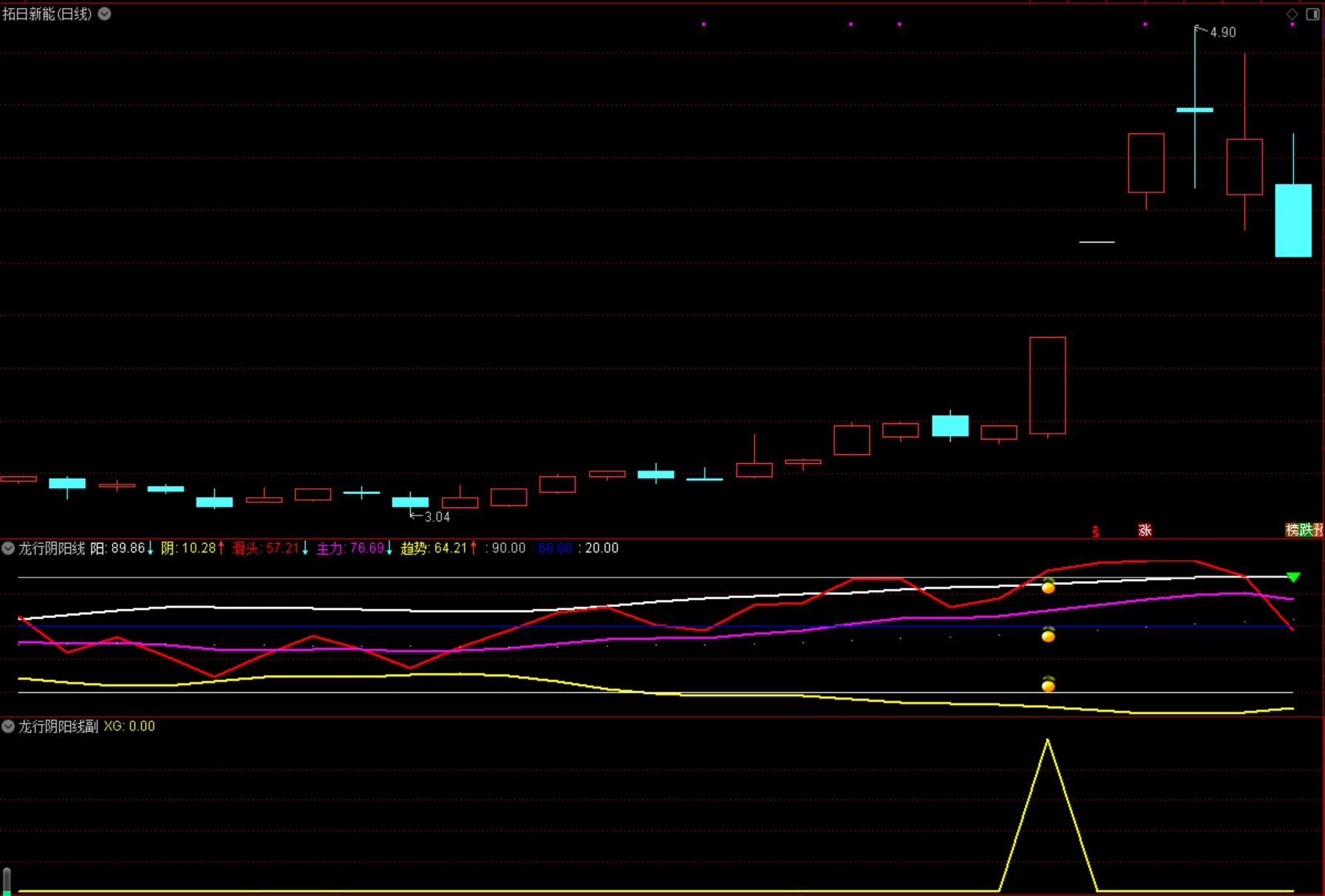 龙行阴阳线优化指标包含 2副图 2选股,监控强势波段起点抓妖,无未来函数,手机电脑通达信通用,信号供参考。