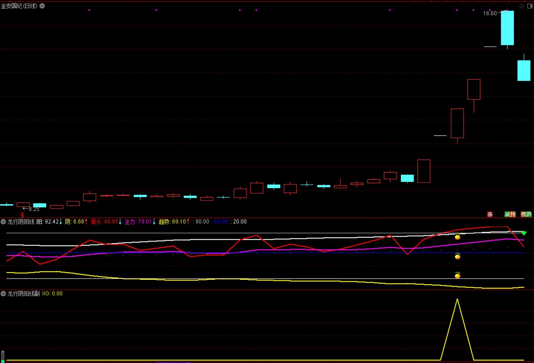 黑马像:两日内滑头线从阴线下方,穿到阳线上方,该股极可能是黑马,日后跟踪择时介入。