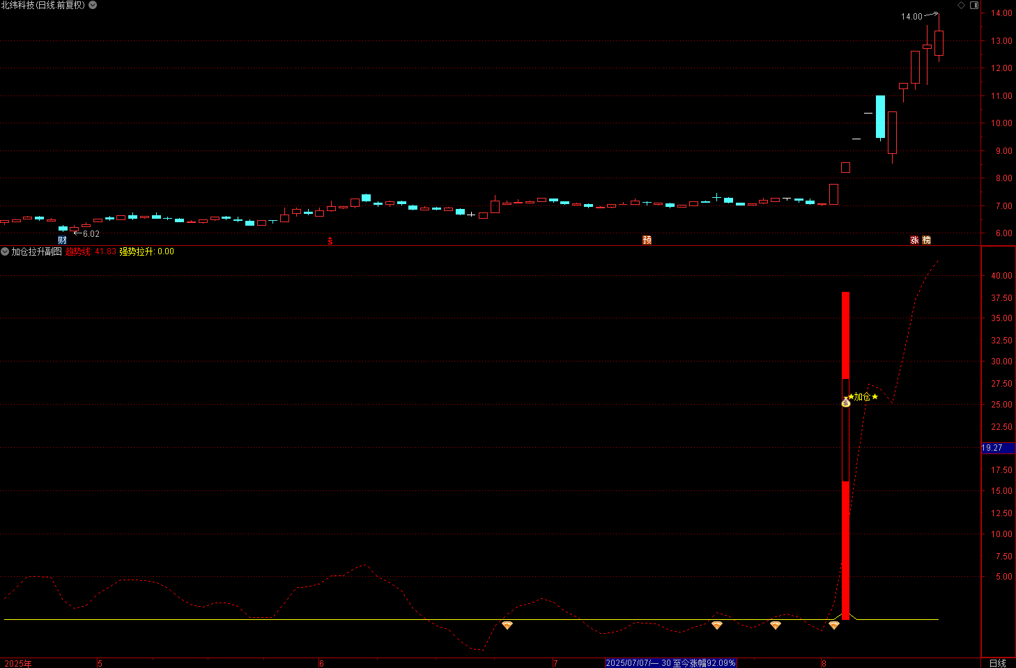 通达信钻石加仓拉升副图/选股 捕捉股票强势突破信号 源码 指标主要用于捕捉股票强势突破信号,核心功能及策略如下: 核心计算: ABC系列:通过三重EMA计算价格趋势强度(红色点线趋势线) ACB系列:结合13/9/100日高低点计算超买超卖状态 操作策略: "强势拉升"信号:当股价突破近期最高量对应价位且涨停时触发 趋势确认:红色趋势线上穿强势信号时出现加仓图标 视觉强化:用三重红色柱状突显拉升信号,黄色文字提示加仓