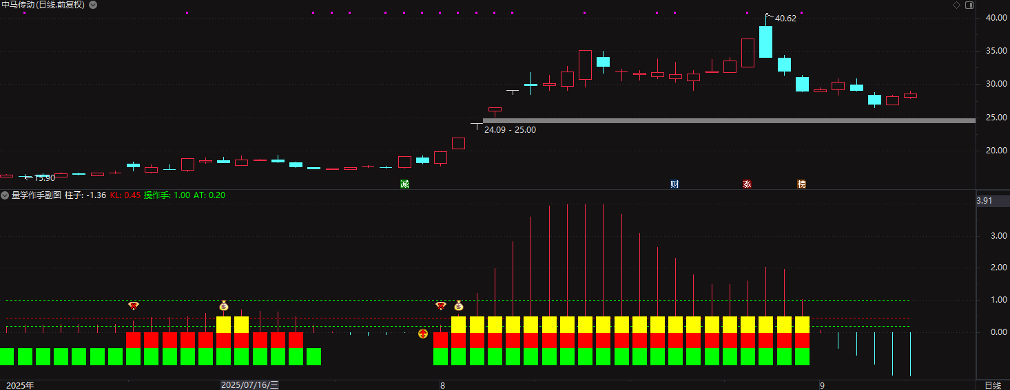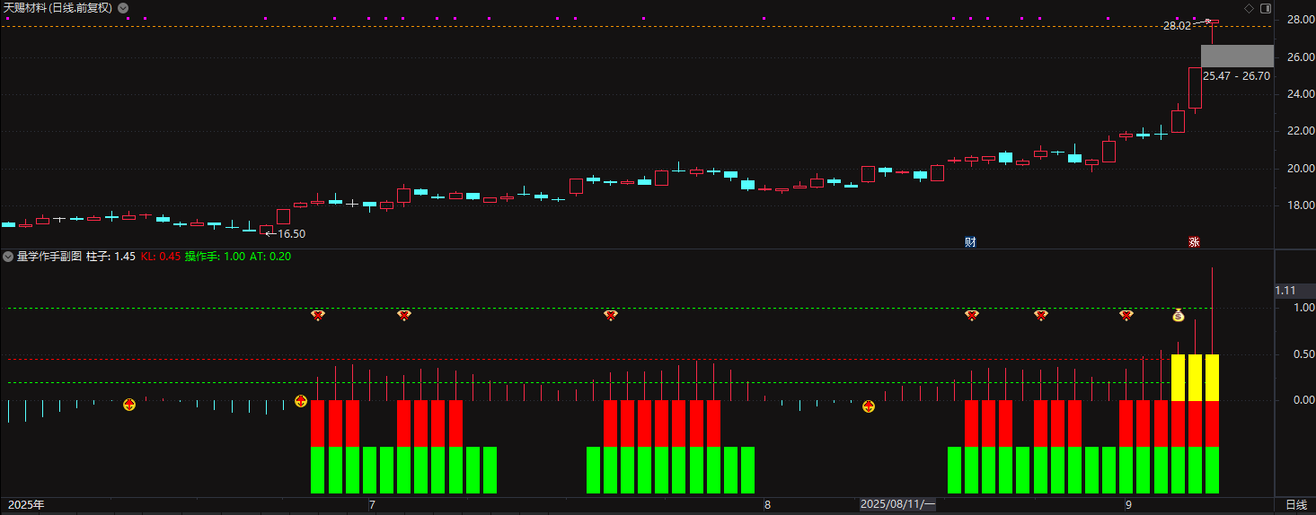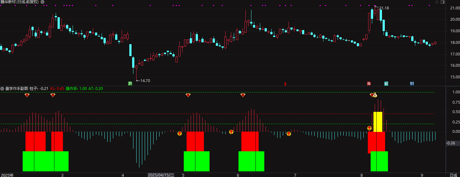 该指标更适合短期(1-5 天)交易参考,需结合成交量、大盘环境等因素综合判断; 黄色五角星信号出现频率较低,一旦出现往往伴随较强爆发力,但需注意追高风险; 股价在 20 日均线(AA 条件)之上是重要前提,若股价跌破 20 日均线,即使出现买入信号也需谨慎。