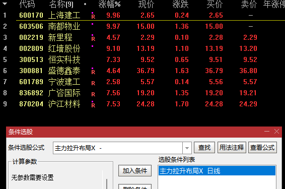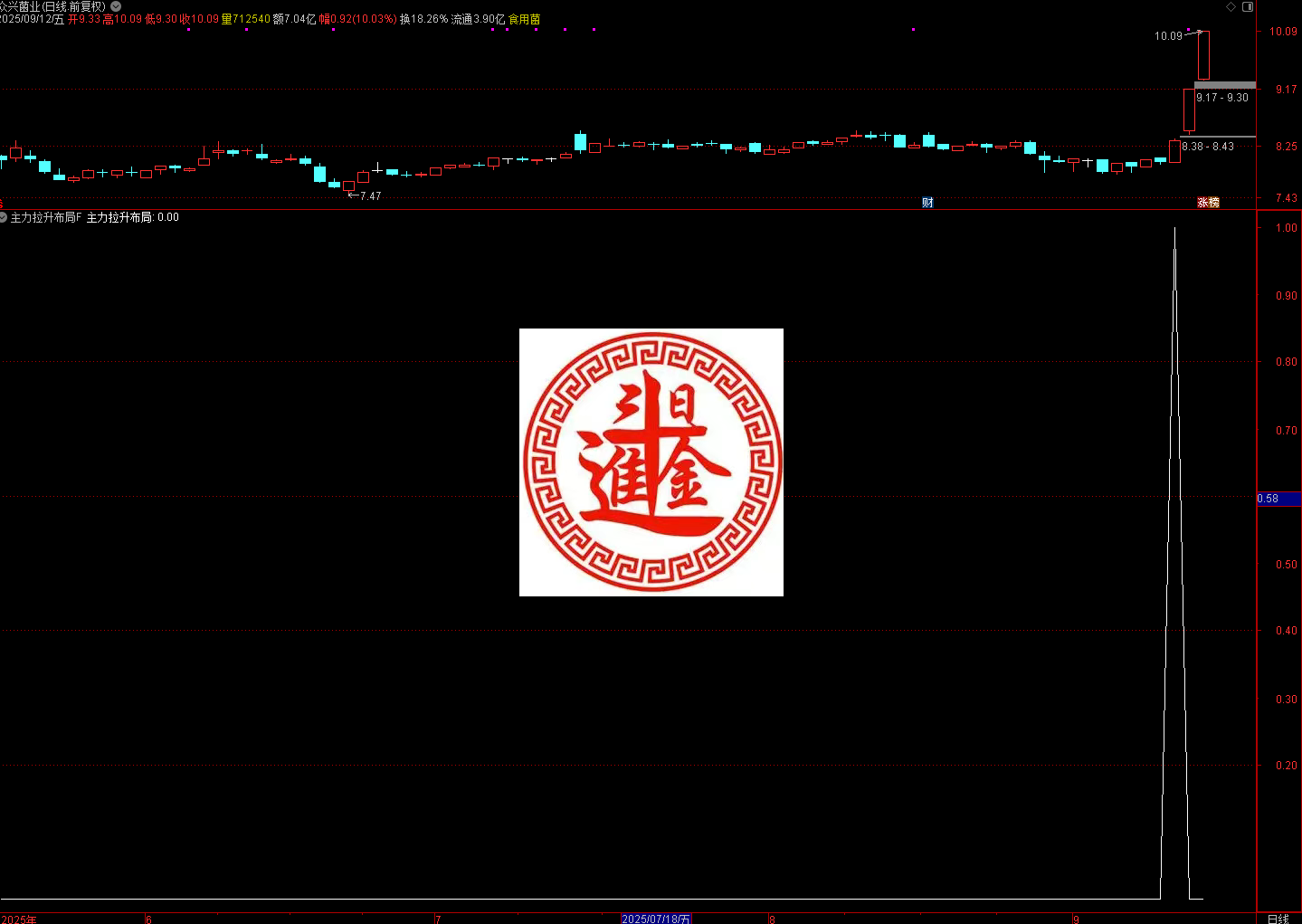通达信日进斗金之主力拉升布局指标,这个公式是一个专注于识别主力拉升前布局信号的技术指标,通过多维度指标组合,捕捉个股在中期上升趋势中主力资金可能开始主动拉升的阶段。