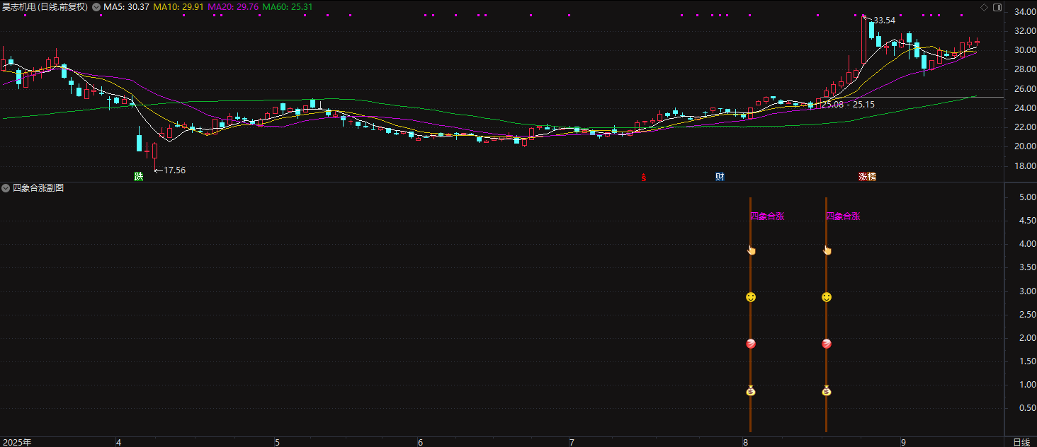 指标通过分析K线走势、MACD、KDJ和波段数据,寻找多指标共振的买入机会。当股票出现连续上涨回调后的企稳形态,同时满足MACD金叉、KDJ金叉或波段买入条件时,触发蓝色柱状信号和多重图标提示。操作上可关注此类信号,结合股价处于60日均线上方的条件进行波段布局。