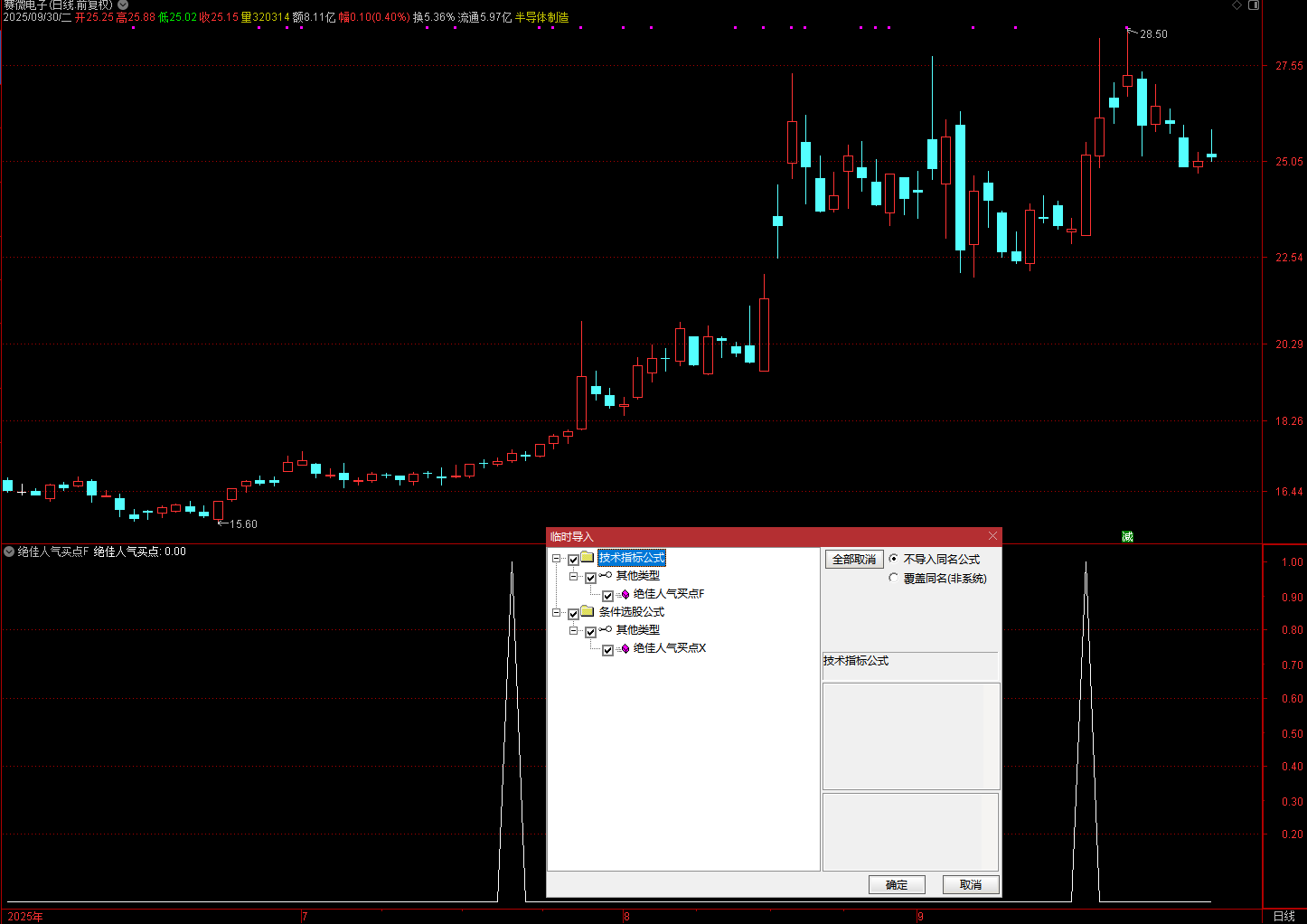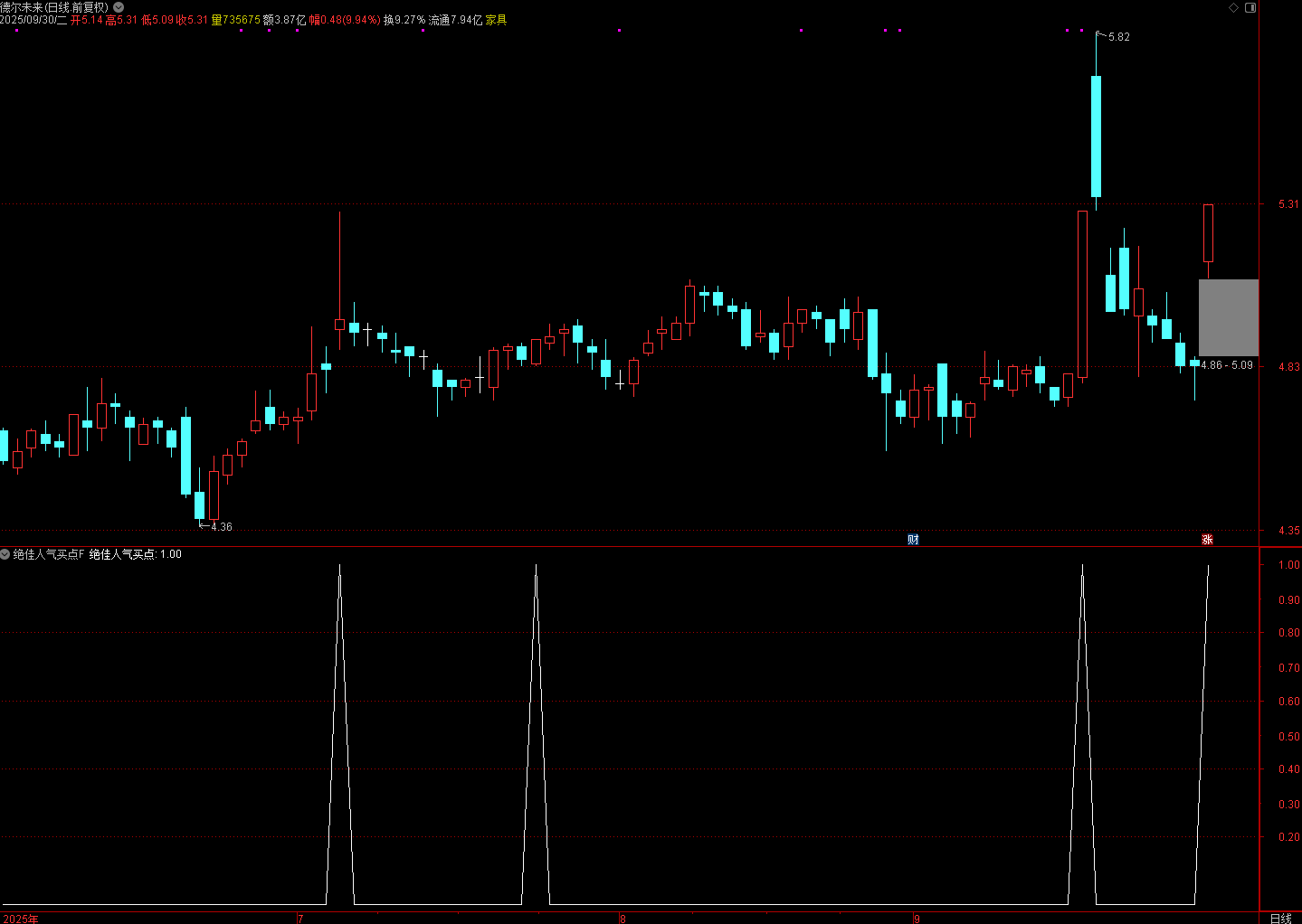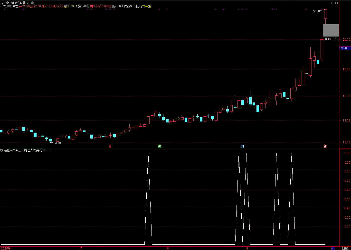 信号出现:当 “绝佳人气买点” 为 1 时,表明个股满足: