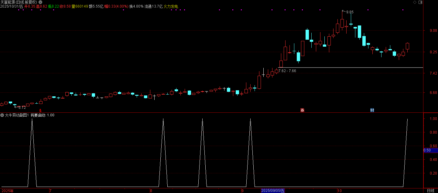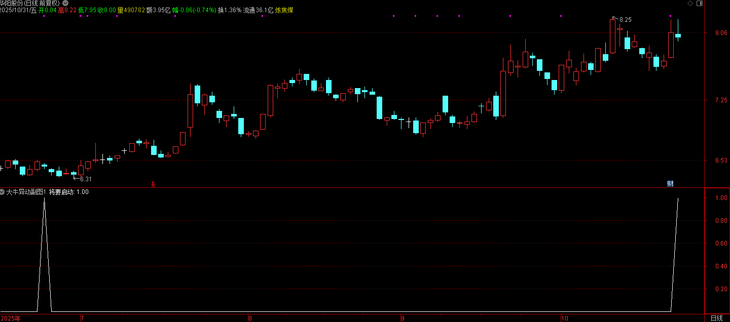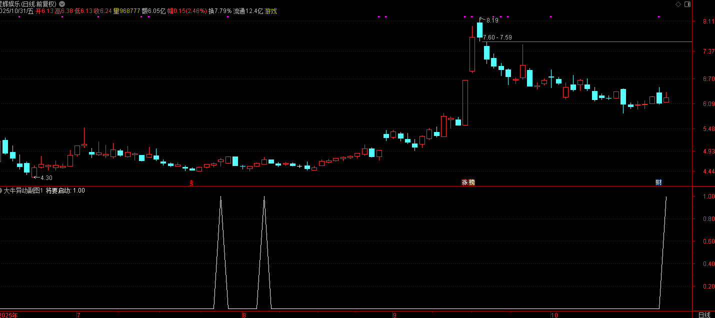 通达信大牛异动指标,本指标为股票技术分析中的趋势启动信号指标,通过结合短期价格趋势变化与股价异动频率,筛选出“短期均线金叉+异动率符合特定条件”的潜在启动个股,为投资者捕捉股价阶段性启动机会提供技术参考。