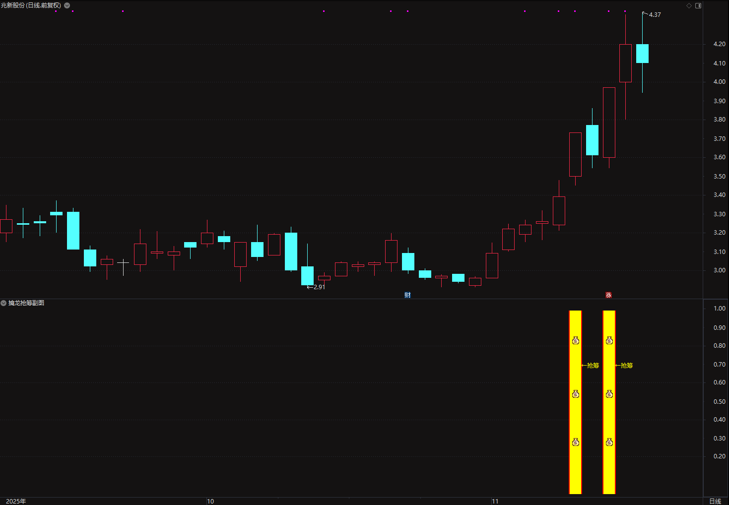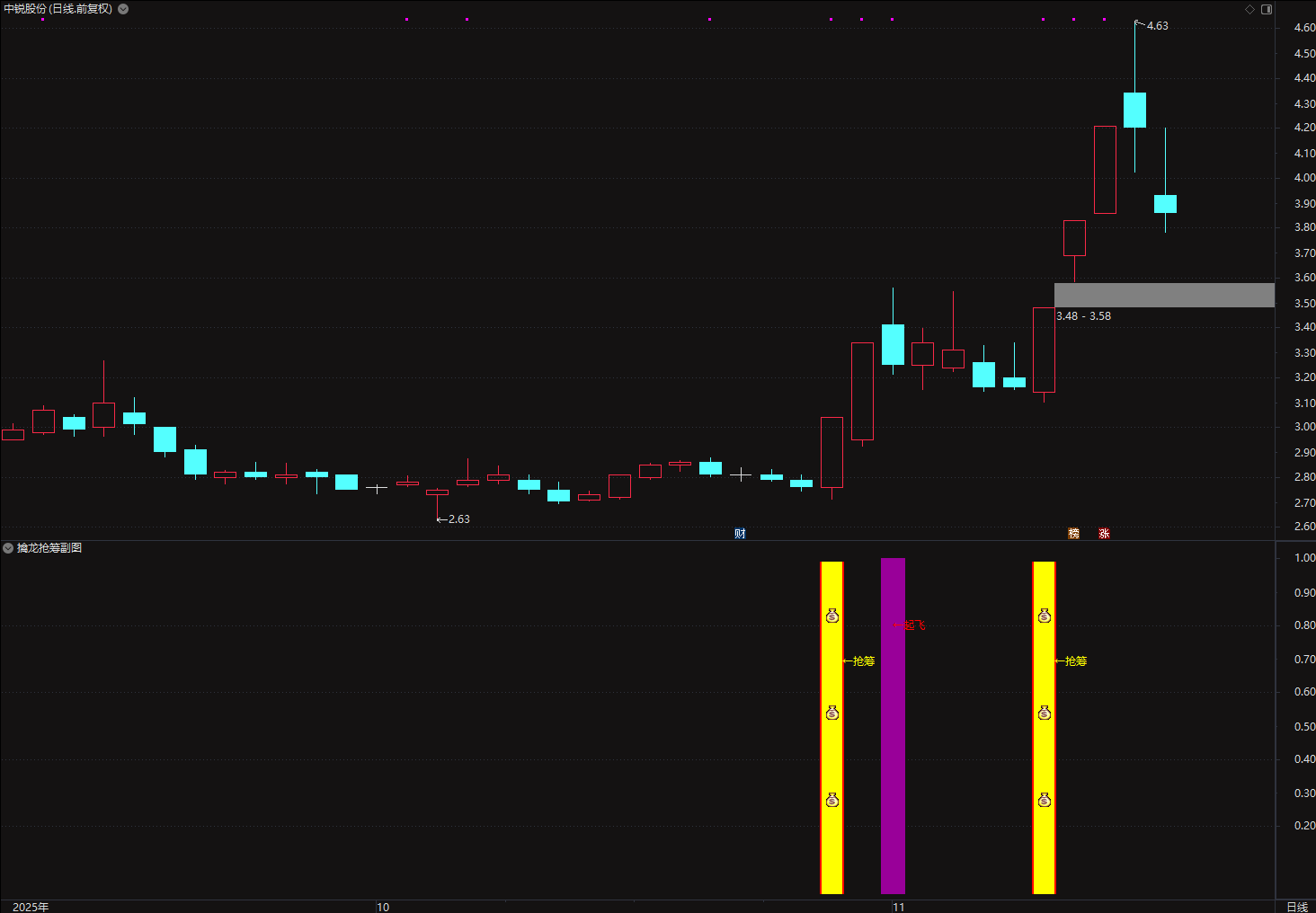 副图黄色柱子现钱袋子信号,标志擒龙指标主力介入启动,此时主力有强力拉升意图,需结合热门概念综合判断提升胜率。