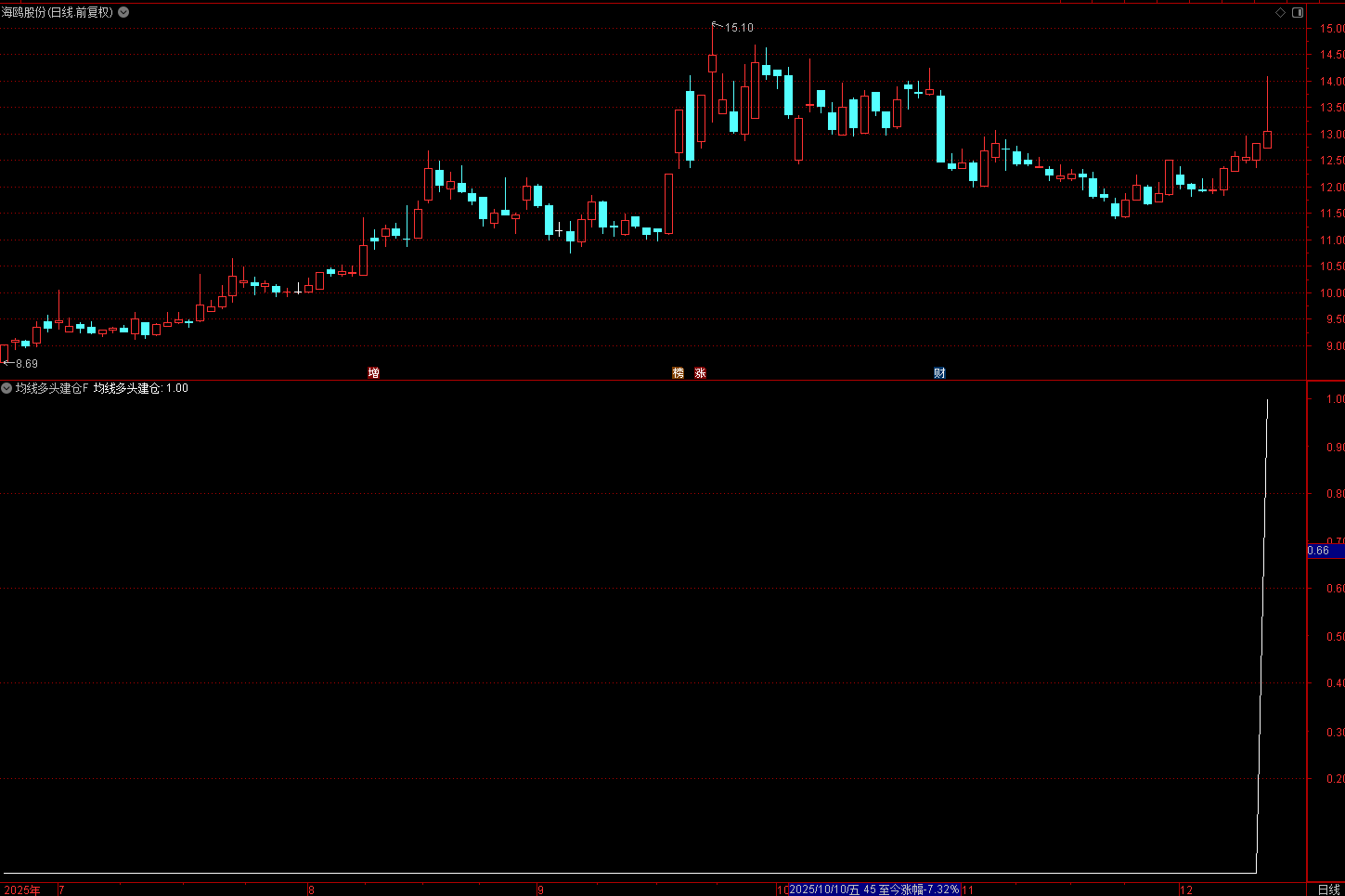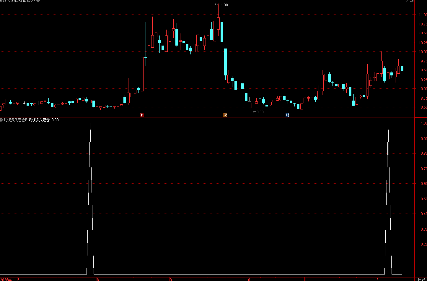 指标通过分步计算趋势、动量、量能、换手四类核心变量,最终通过多条件组合输出“均线多头建仓”信号