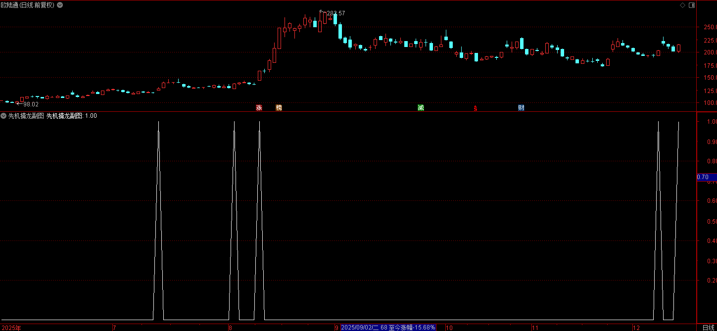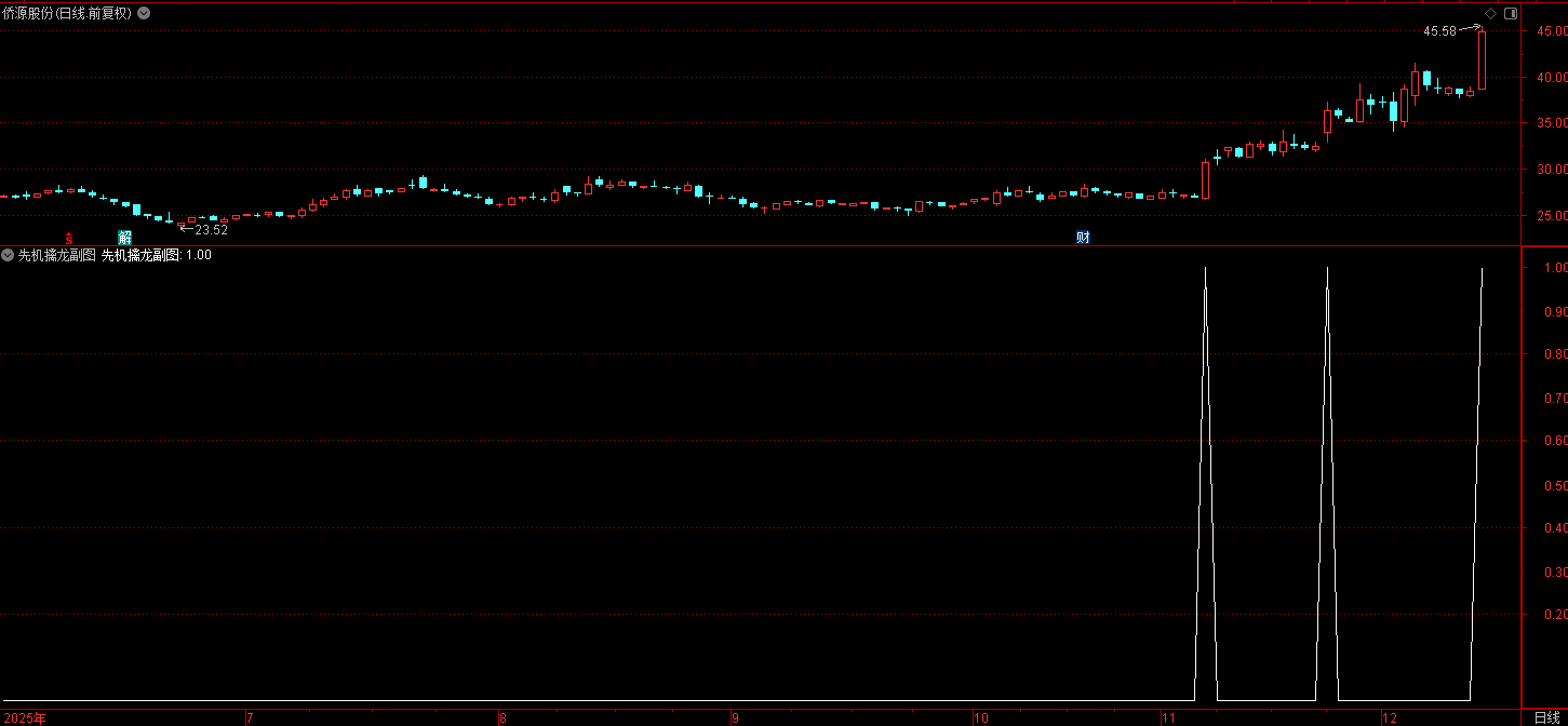 通达信先机擒龙选股副图指标,该公式是一套多维度筛选 + 强信号共振的短线擒龙指标,核心融合 “MACD 变种动能、均线趋势、量能、筹码风险、价格形态、超跌突破” 六大维度,仅当所有条件共振时触发 “先机擒龙” 信号,专为捕捉强势牛股启动点设计,筛选标准严苛、信号胜率高但频率低。