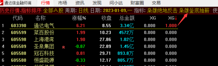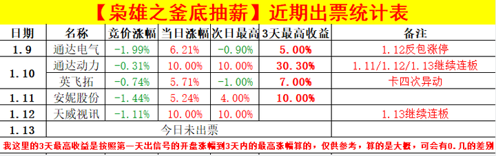 对于我们这三个指标的一个联合使用方法,举个例子来说,1.6号在枭雄首板竞价出的信号,当天涨停被砸收盘未封板,1.9号枭雄绝地反击又出现了这只票的信号,那1.9号就可以先低吸,再等盘中拉高把1.6号的仓位T出去(1.9号盘中最高又拉到涨停没有封板,那你已经做T了就不用管了),1.10这只票在枭雄首板竞价又出信号了,你就可以再等等有没有涨停机会,那1.10号就涨停封板了,那你就可以在涨停板上把1.9号的仓位全部卖出,这样就做了一次完美的高抛低吸了,这连续3天做了高抛低吸的做的好可以做到接近20个点的利润了。我们根据指标来,当天出的票最多关注3天,不要太贪心。就比如这只票,你1.10号看涨停了舍不得走,1.11号低开这时候你再离场,你又损失了几个点的利润,特别是连续3天大阳线的票,做超短的就不要持有太久,你永远不会知道第二天会是什么情况,有盈利的见好就收就好了。