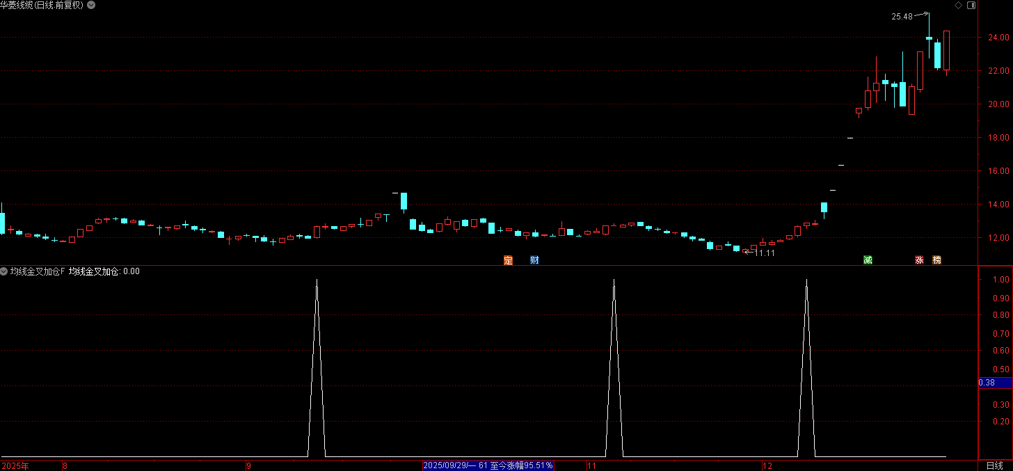 5日均线刚刚上穿 40日均线(均线金叉),且当天收盘价站上双均线,40日线拐头向上;这是「短期趋势 + 中期趋势」的双重共振买点,代表中期多头趋势正式启动,属于「趋势确立的第一买点」,买入后趋势延续性极强,适合中线买入,盈亏比极高。参考使用。