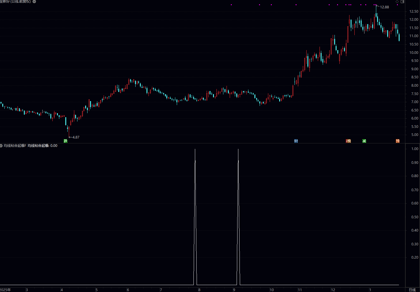 1.必须搭配成交量确认:均线粘合起爆的核心是“打破平衡”,若信号出现时成交量放大(至少大于近5日平均成交量),说明资金进场,起爆概率极高;若成交量萎缩,大概率是“假信号”,需谨慎规避。