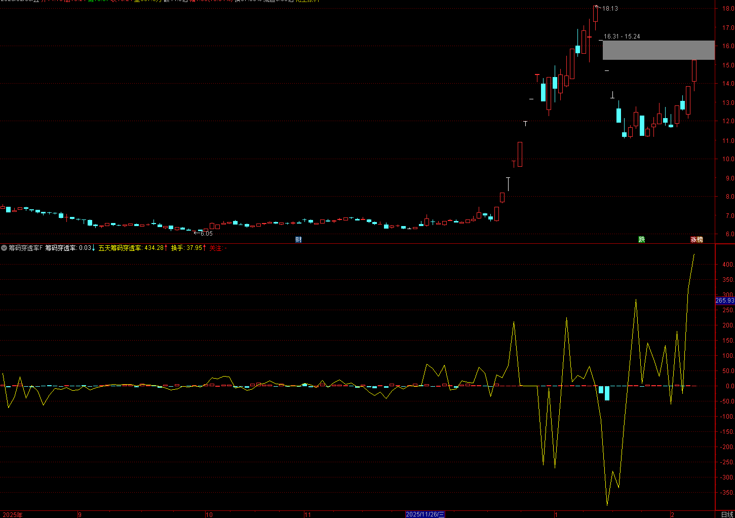 筹码穿透率:衡量 “以当前换手率,股价穿透筹码密集区的能力”,数值越高,说明资金推动股价突破筹码区的力度越强