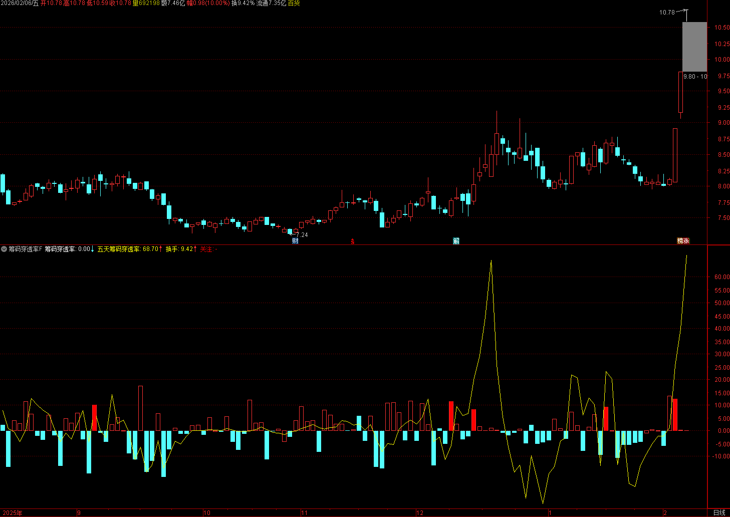建议结合筹码峰:穿透率 > 8 且股价突破筹码峰上沿,信号更可靠