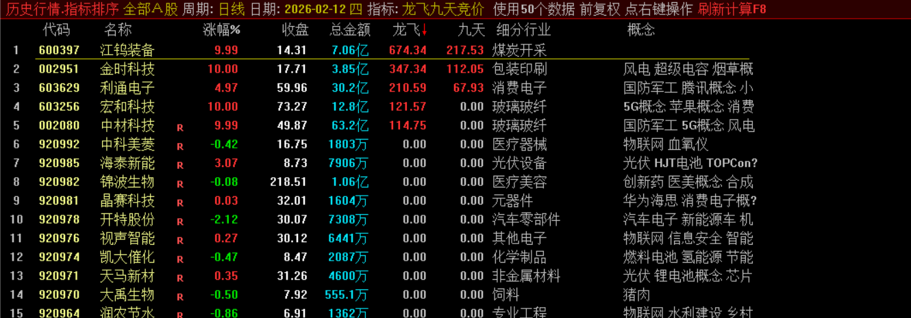 它综合考量个股的安全评分、近期是否连续涨停、开盘涨幅、前一日是否为一字涨停等因素,并结合资金面和流通股本数据,计算出一个“龙飞”动能值。