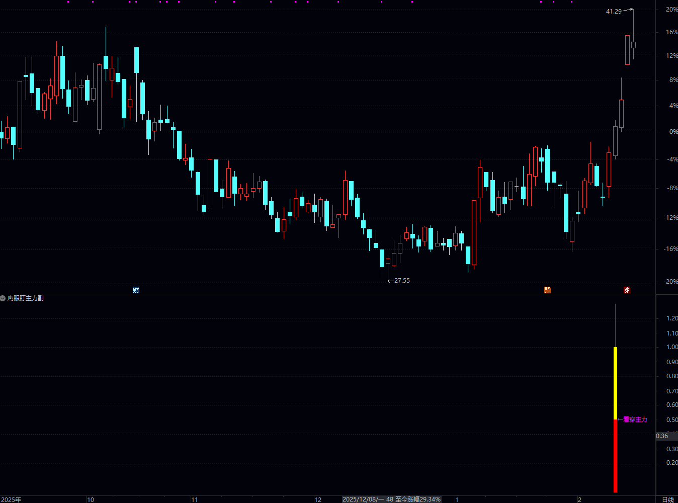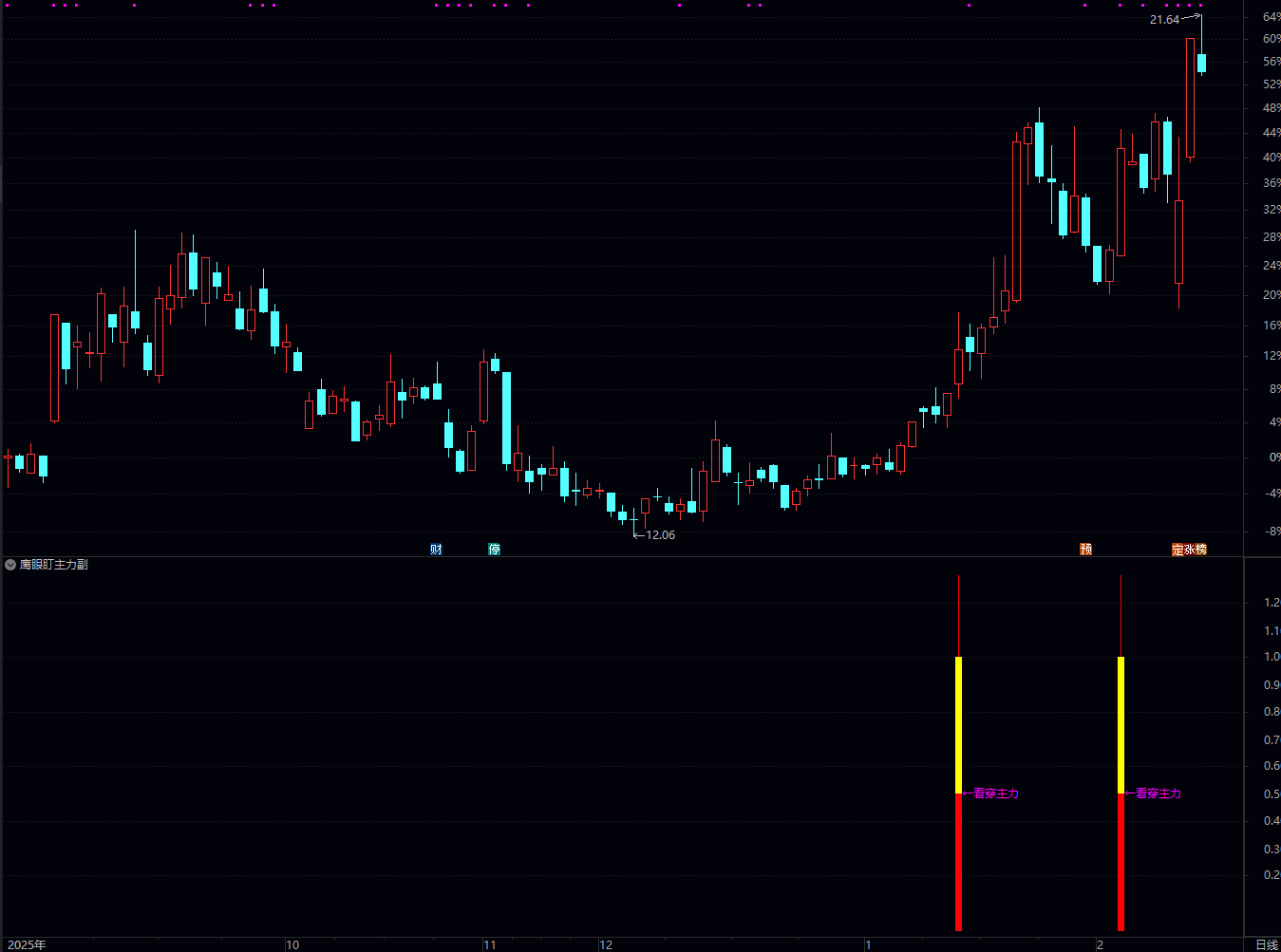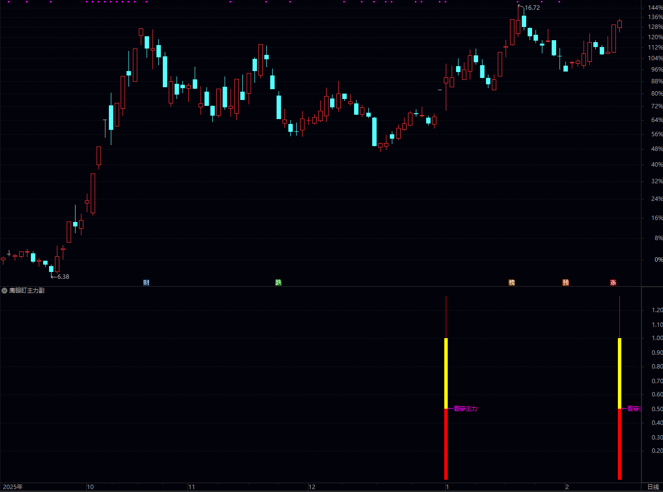 指标通过分析筹码分布与价格关系,识别主力资金可能介入的时机。核心逻辑是对比当前获利盘与近期价格波动区间的筹码集中度,当股价处于短期均线上方、主力筹码优势显现且排除涨停干扰时,发出“看穿主力”信号。适用于捕捉主力吸筹初期的低风险买点。