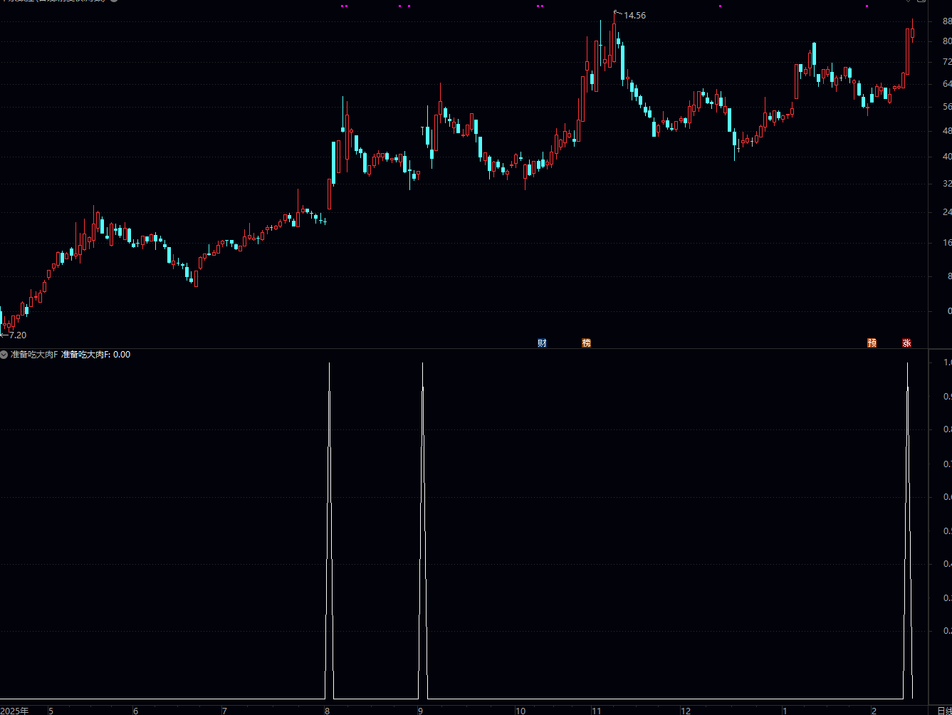 通达信准备吃肉公式是一个短线强势股起爆点选股 / 预警指标,核心是筛选出 “突破 30 日高点 + 放量 + 大阳线 + 30 日振幅有限” 的股票,同时叠加了涨停 / 放量涨停的强信号,最终输出 “准备吃大肉 F” 信号,用于捕捉短期可能大涨的个股。