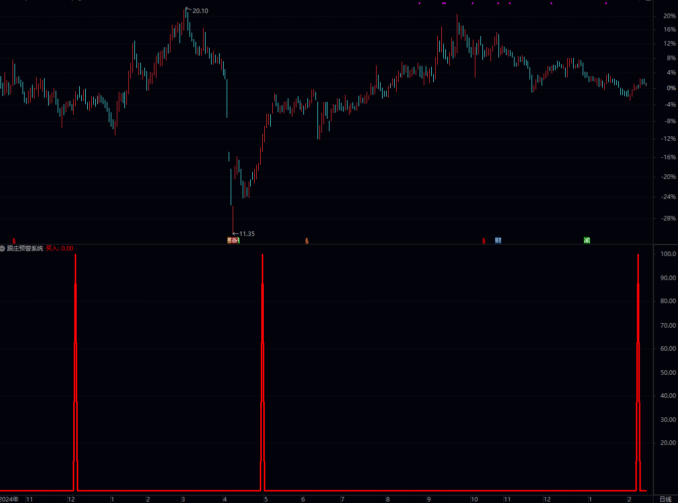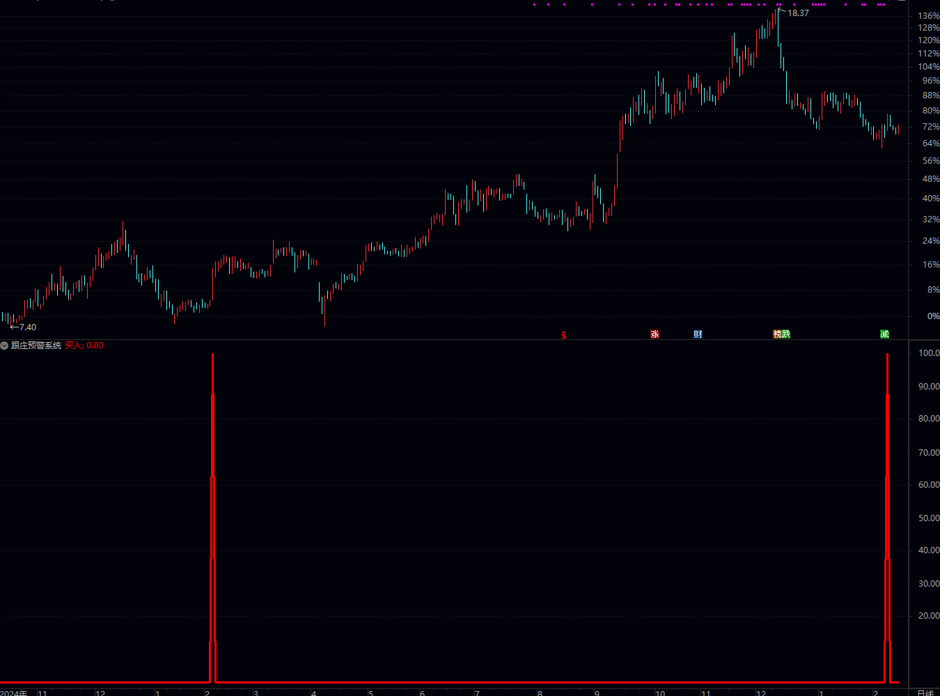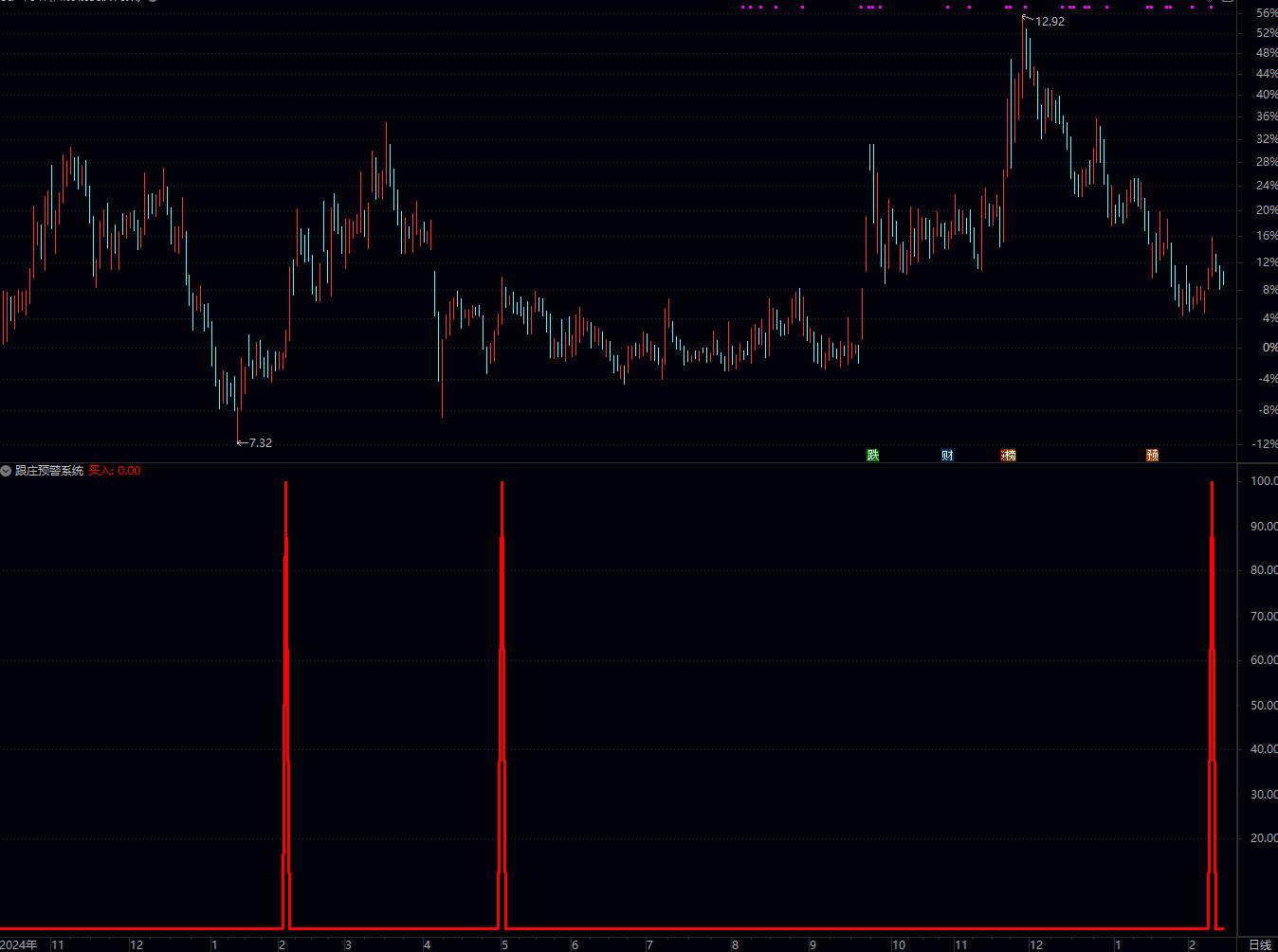 暴涨行情:公式信号滞后,“红军” 和 “预警系统” 会快速冲高,但买入信号可能已错过最佳买点;