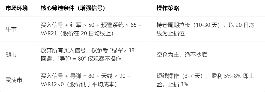 实战中需先判断市场环境,再调整信号筛选条件(如牛市放宽多头阈值,震荡市叠加超跌条件);