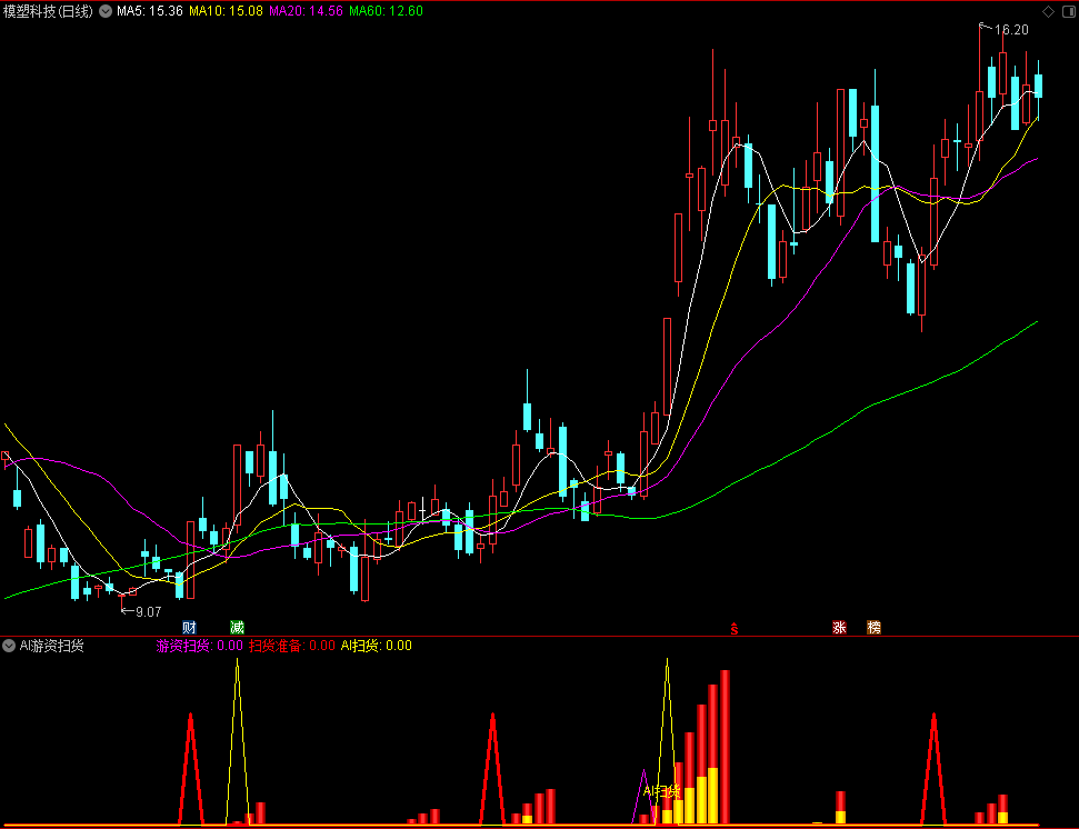 (〖AI游资扫货〗通达信AI游资扫货副图指标,识别低位启动、趋势持股和强势突破机会!源码)