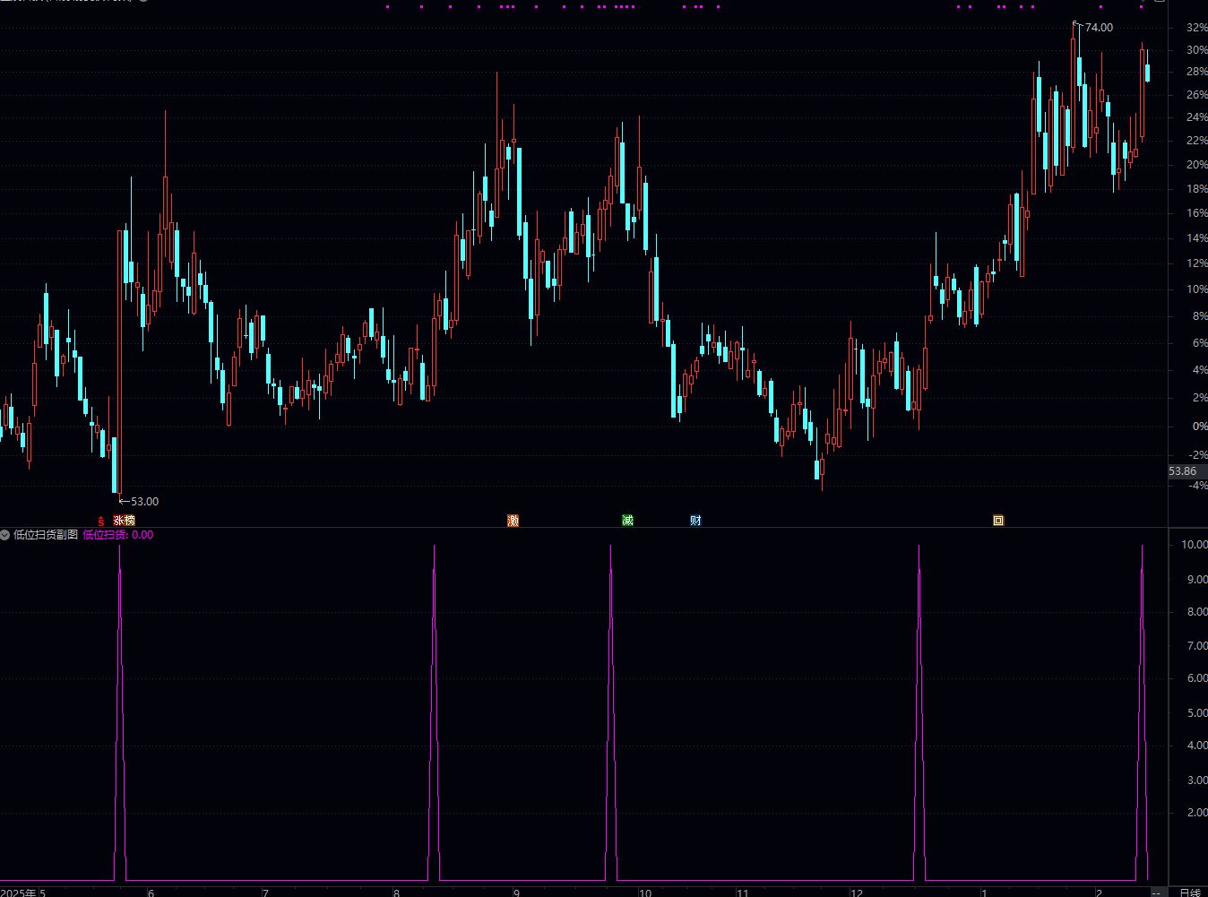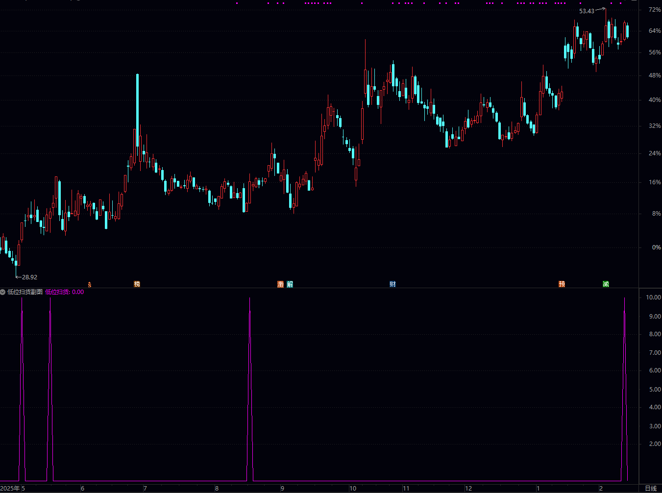 (通达信低位扫货指标属于量价结合型选股/预警指标,核心功能是识别个股在相对低位时,主力资金暗中扫货)