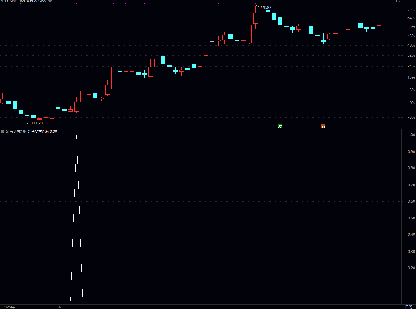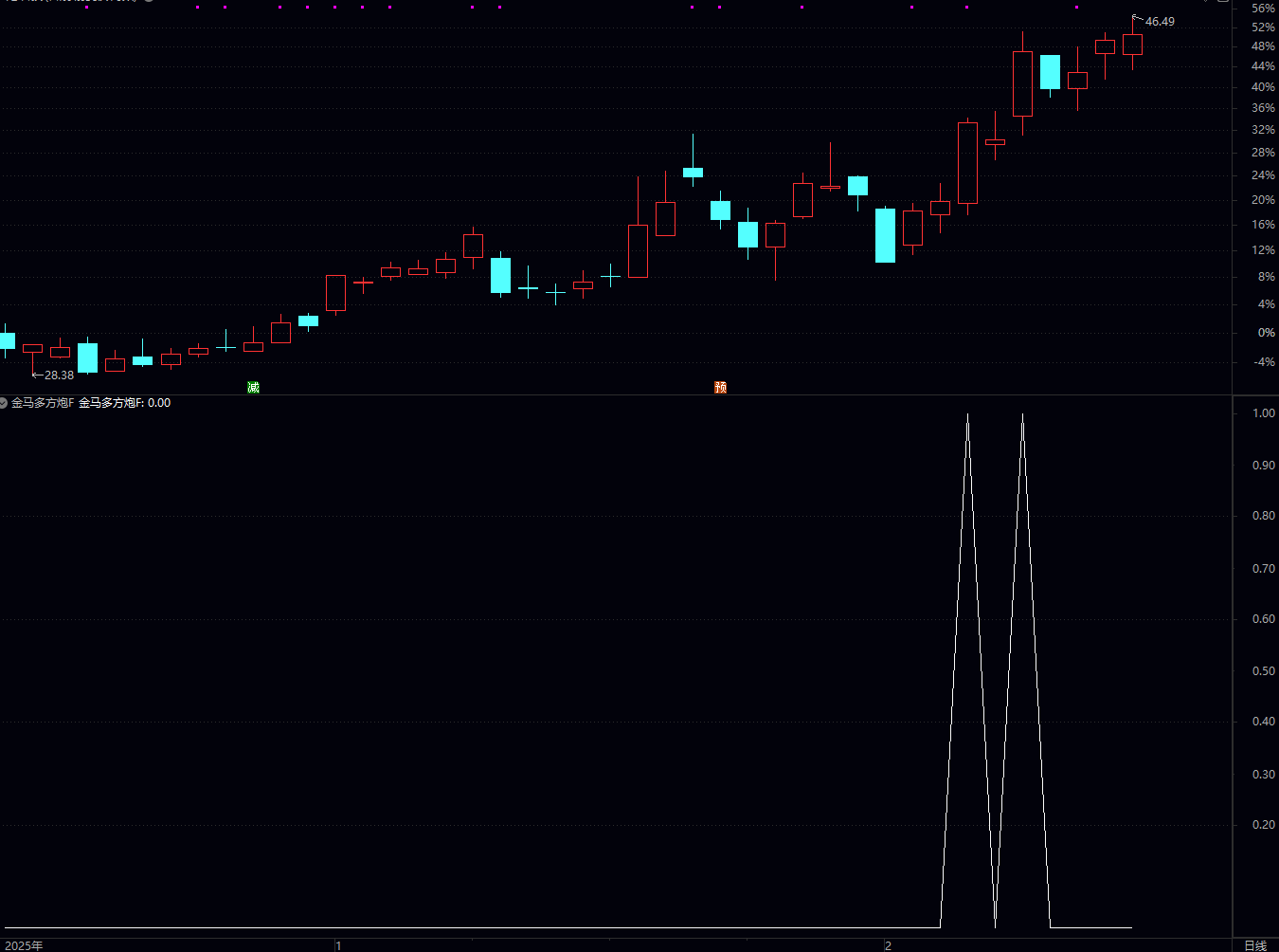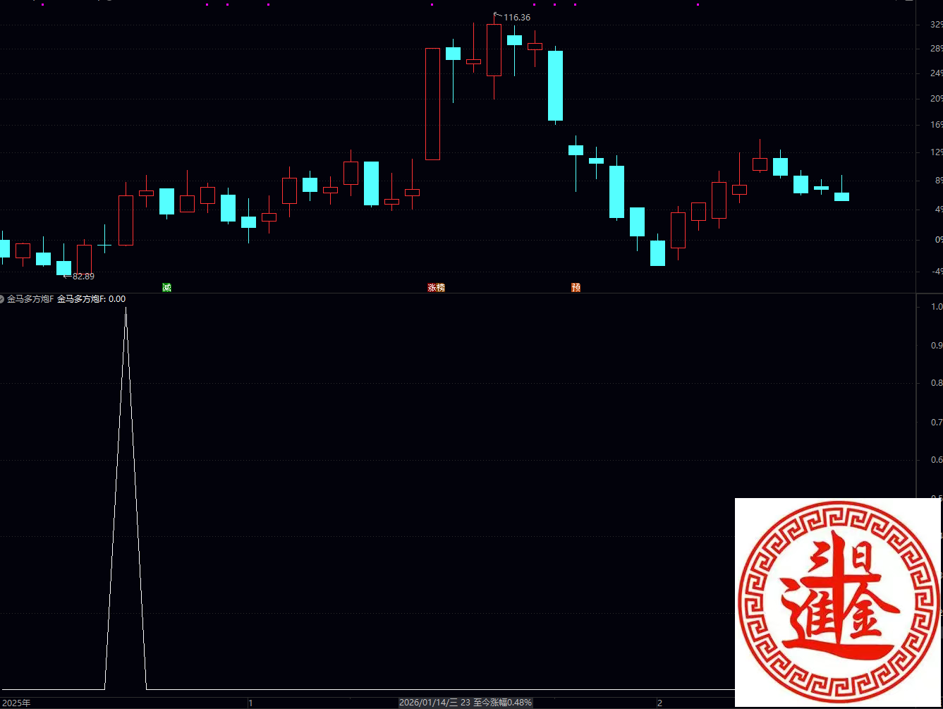 (通达信金马多方炮公式是一个选股 / 副图指标公式,命名为 “金马多方炮 F”,核心是筛选出满足 “强化版多方炮” 形态,且中长期均线呈多头排列、均线角度全部向上的强势个股,属于偏激进的短线 / 波段选股策略。)