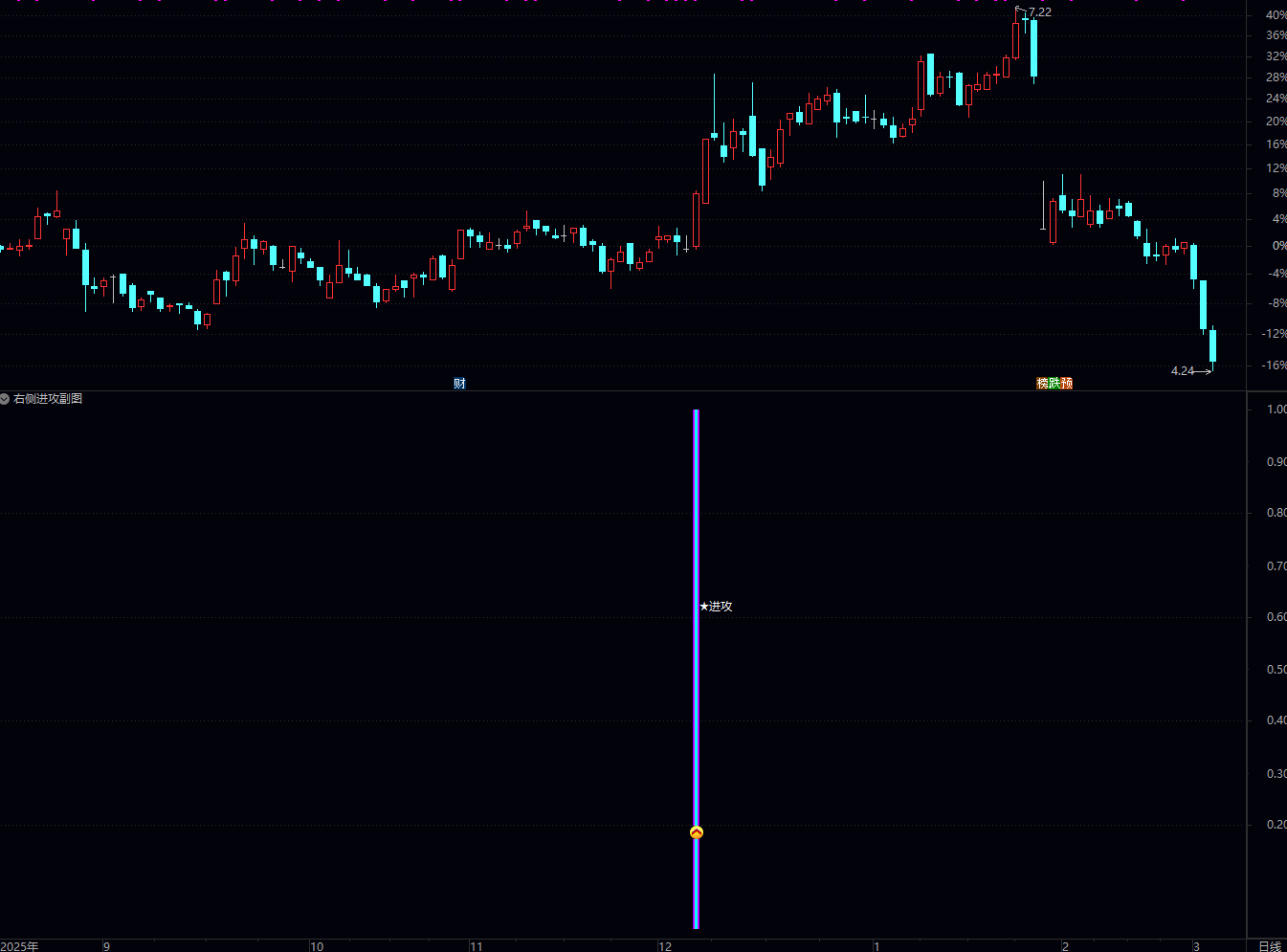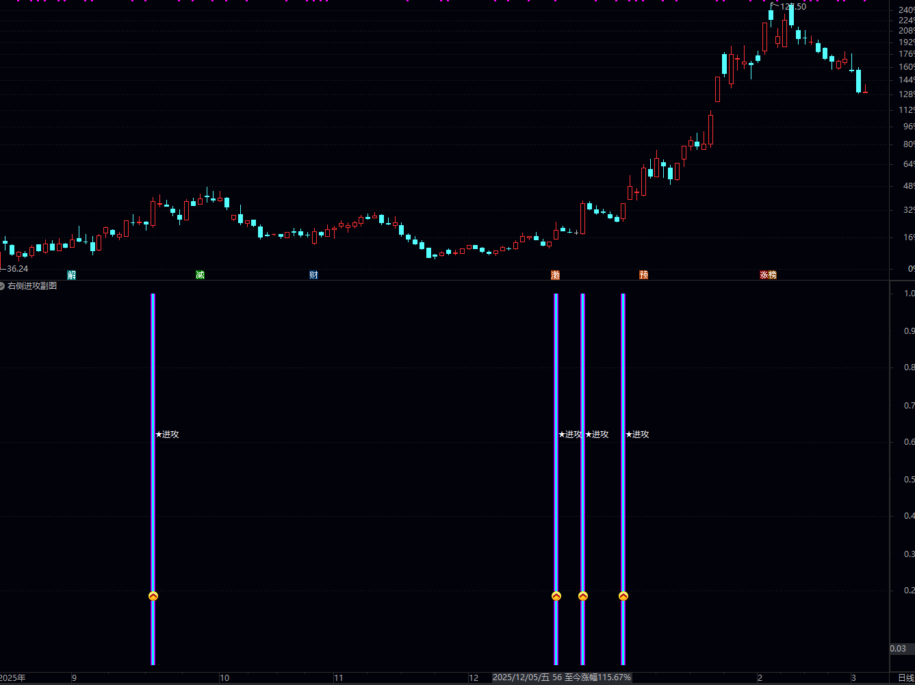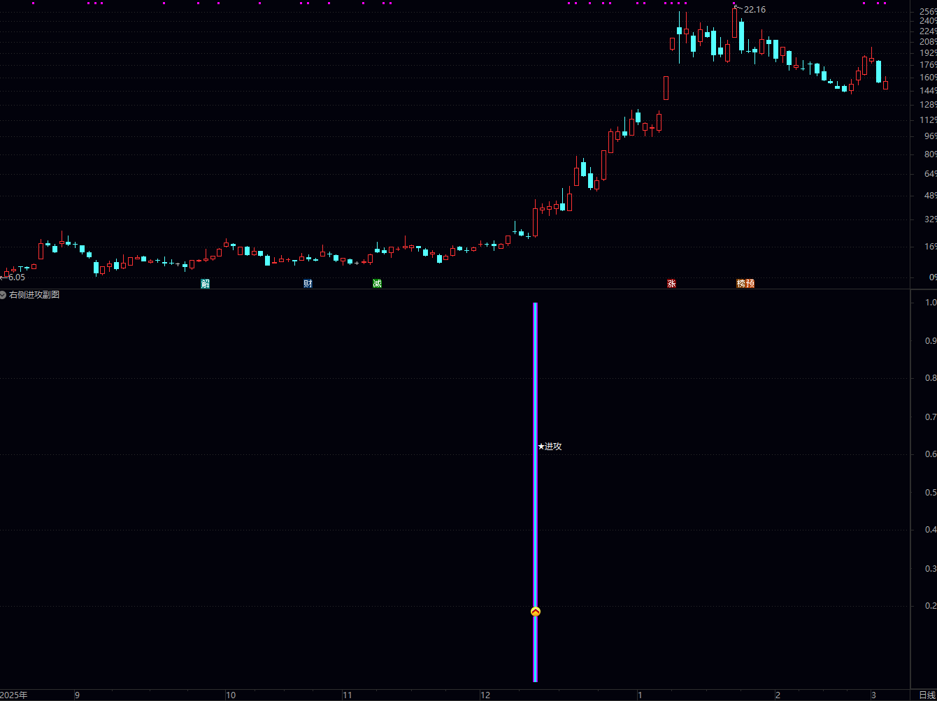 买入时机:当副图出现彩色柱体及“★进攻”字样时,若当天股价涨幅适中(如3%-7%),可在尾盘或次日开盘观察承接力介入;若直接高开涨停,则可关注后续连板机会。