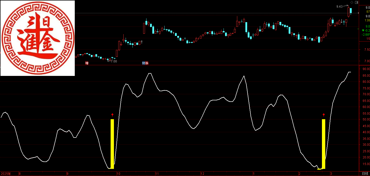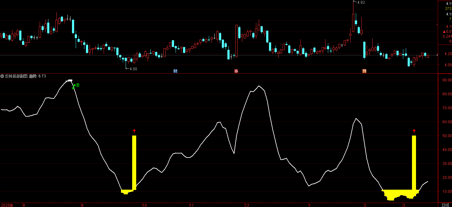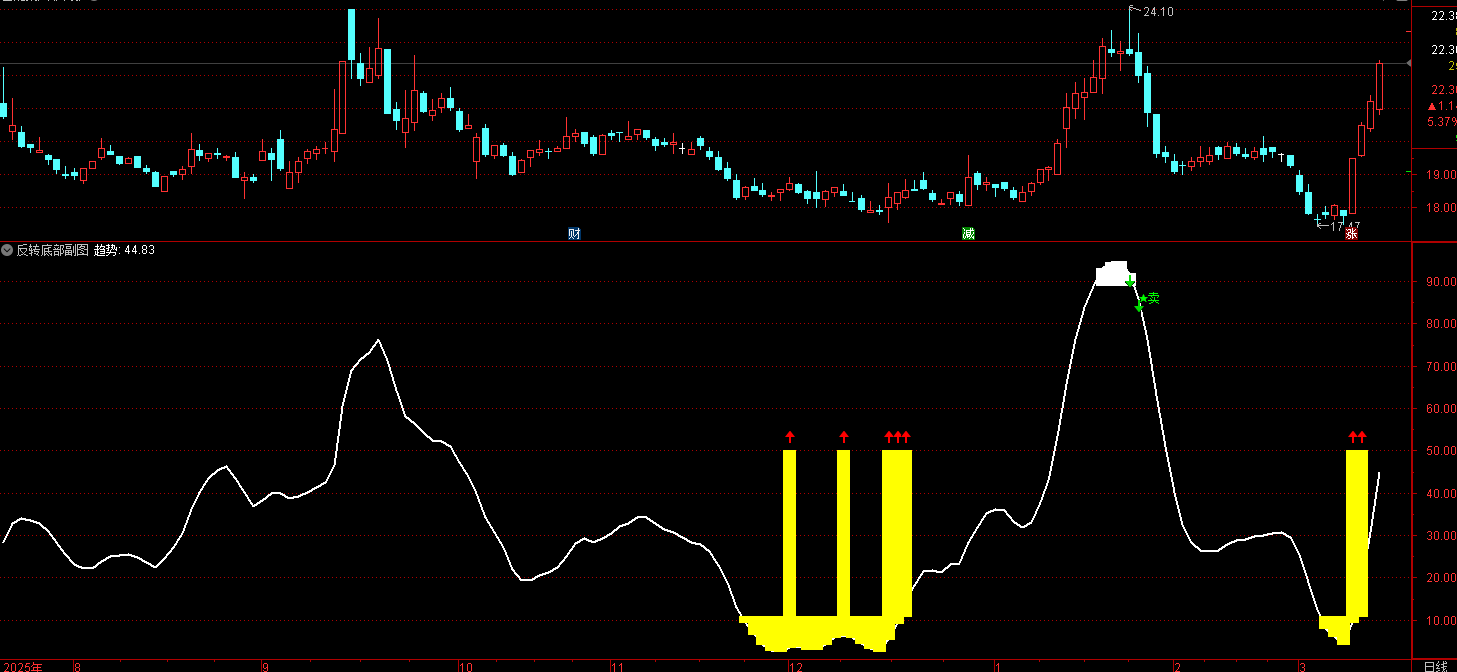 买入信号:当“趋势”指标从低位向上拐头,并上穿超低阈值(如11)时,如果此时股价仍在“中线”下方,系统会在低位显示黄色柱状线和买入图标,提示可能的抄底机会。
