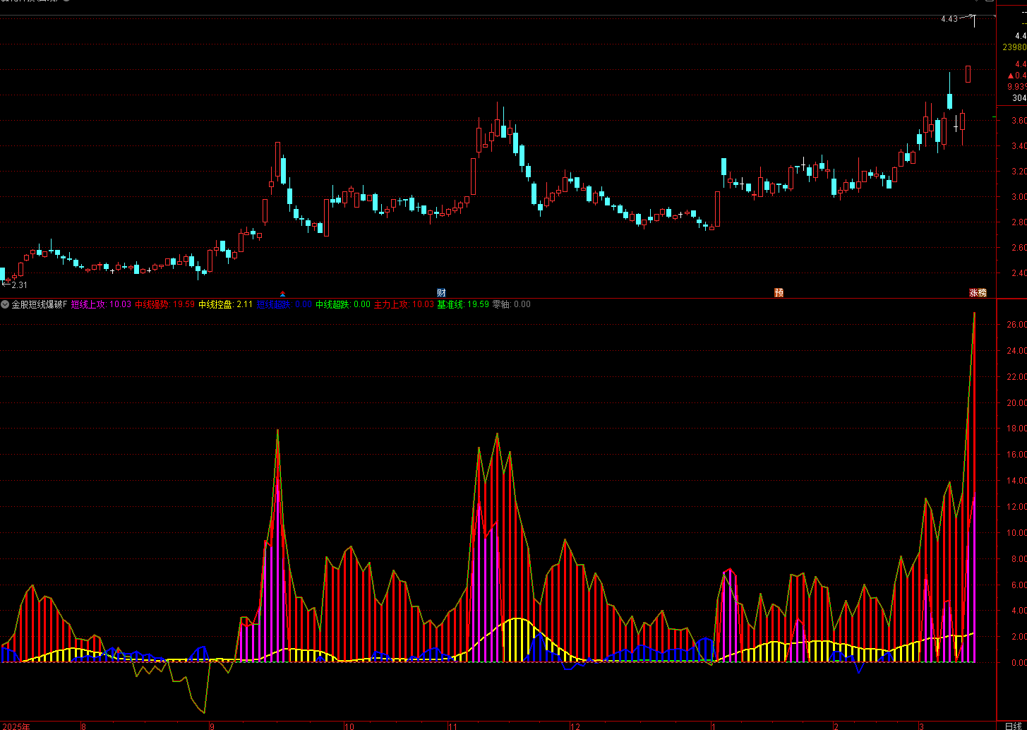 该指标核心是通过 “上攻(红 / 洋红)、控盘(黄)、超跌(蓝 / 绿)” 三类信号的共振,判断股价短中期强弱;