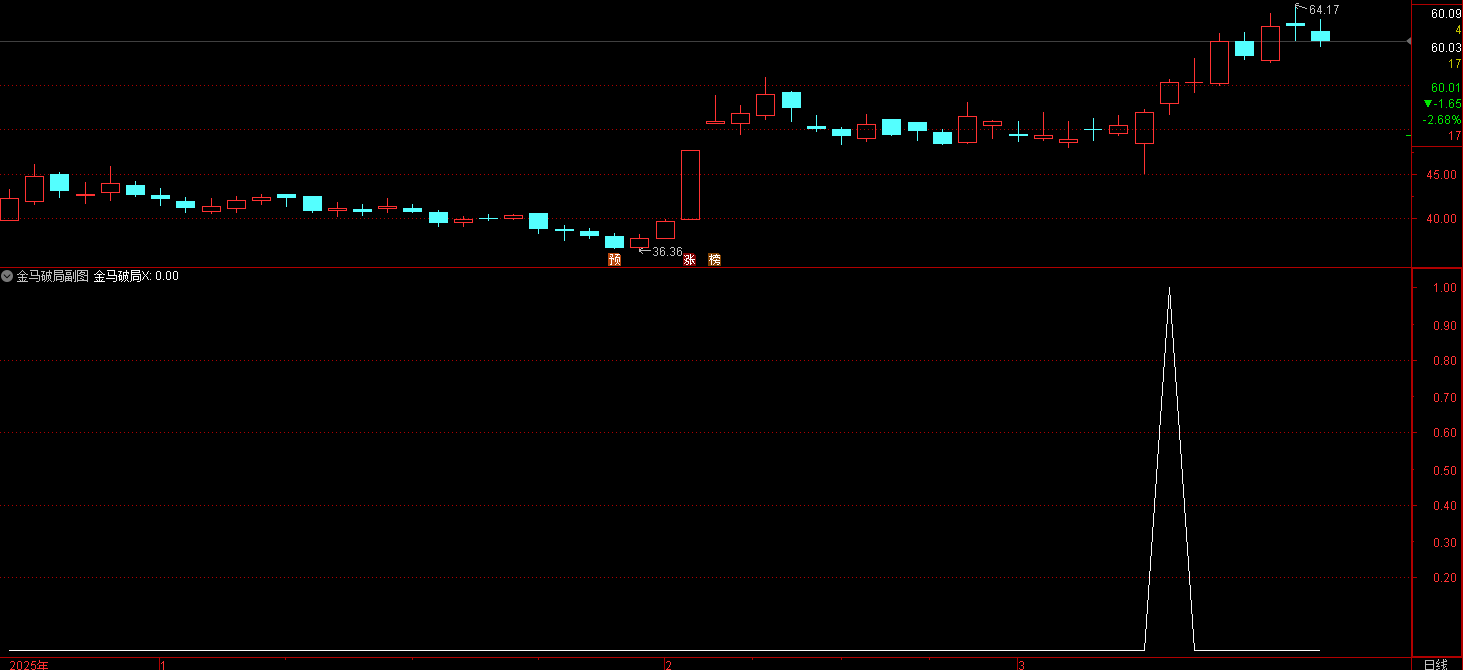出现过涨停 → 连续阴线洗盘 → 期间出现过跌停级别的杀跌 → 洗盘末期首次放量突破洗盘高点 → 发出 “金马破局” 买入信号