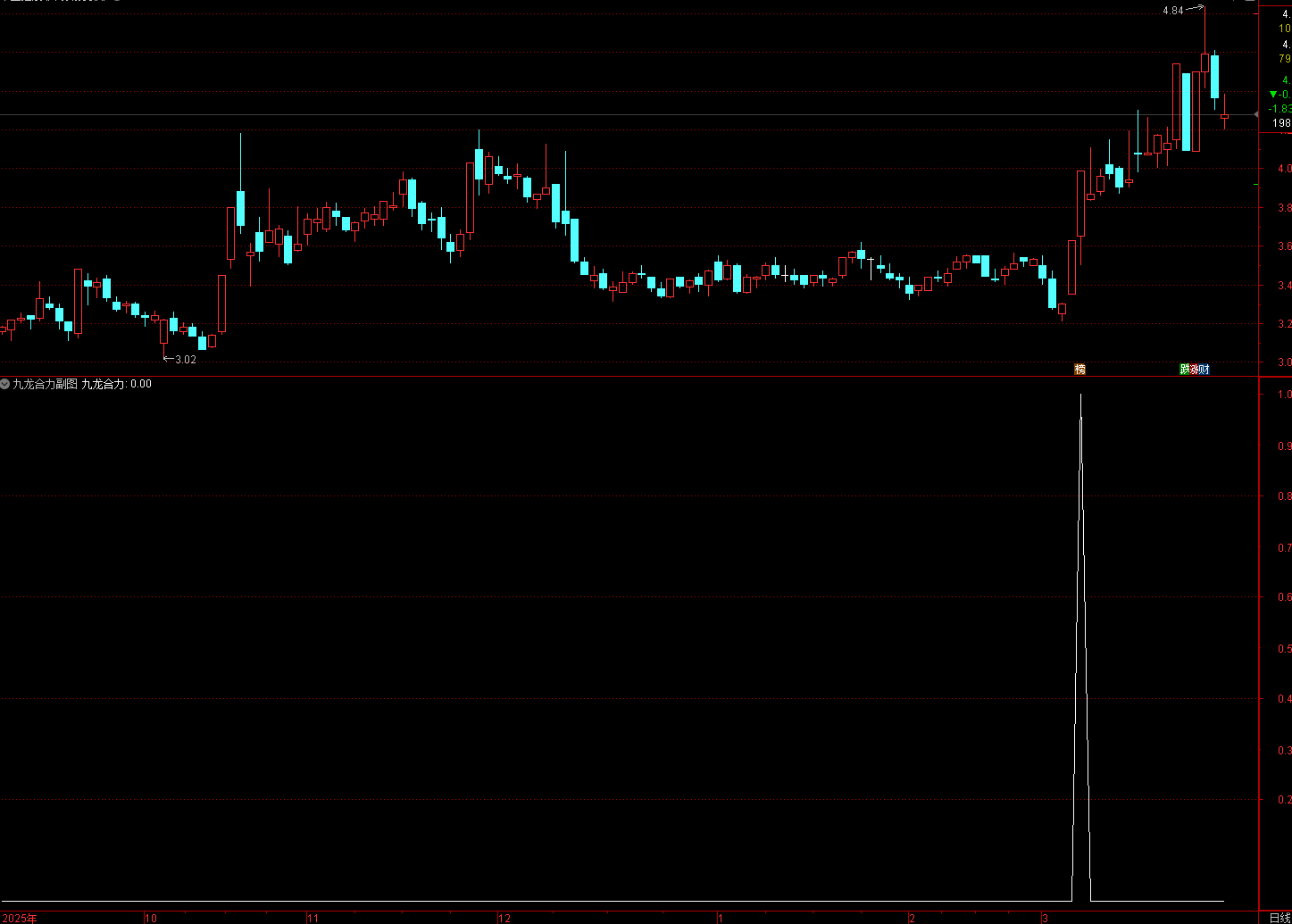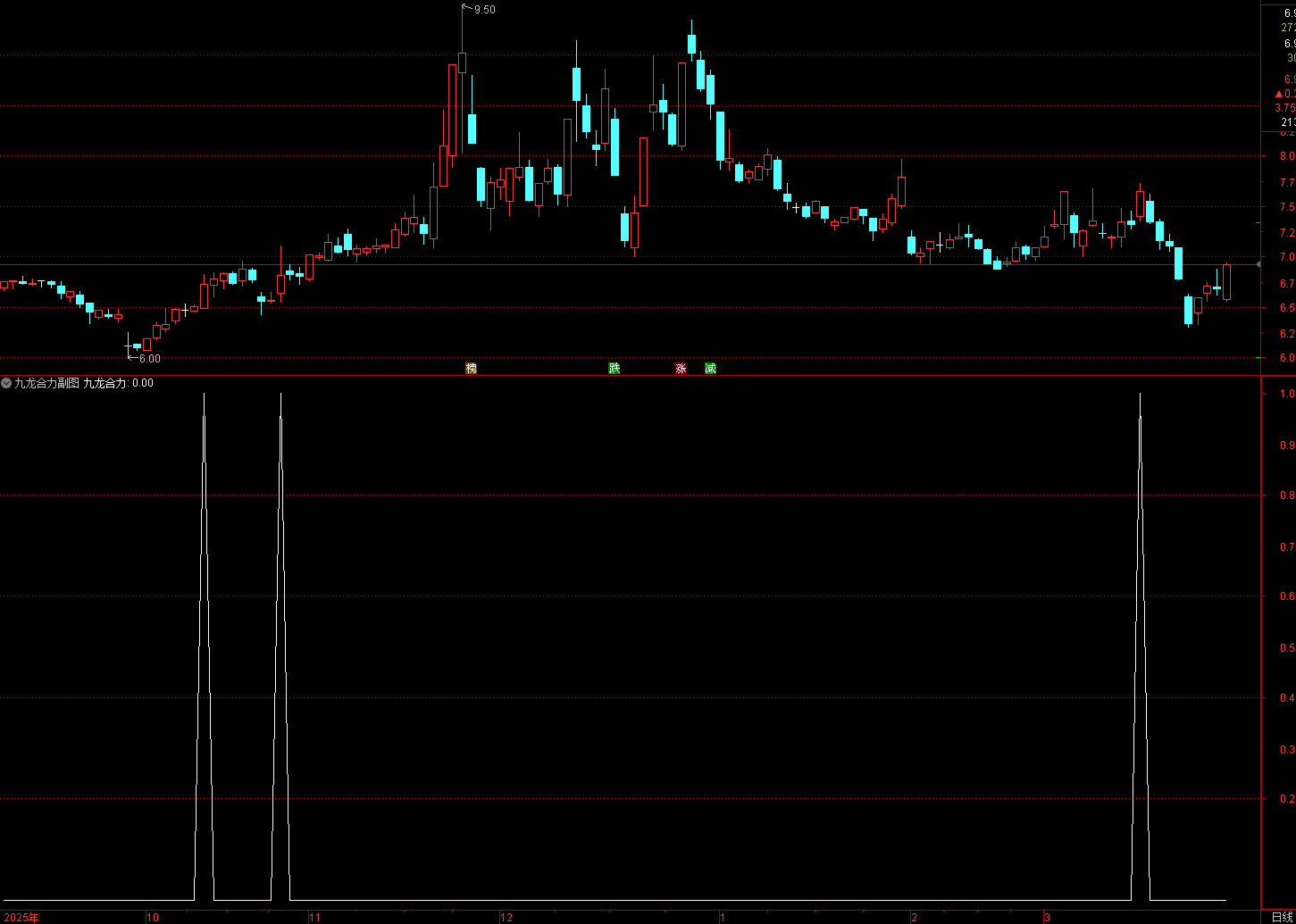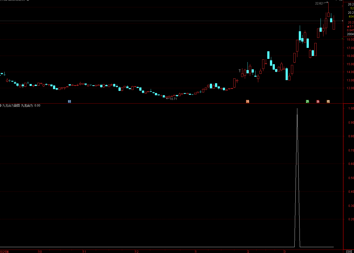 (通达信九龙合力指标中长期趋势打底 + 长期缩量震荡收敛 + 突然倍量阳线拉升 → 低位合力启动拐点)